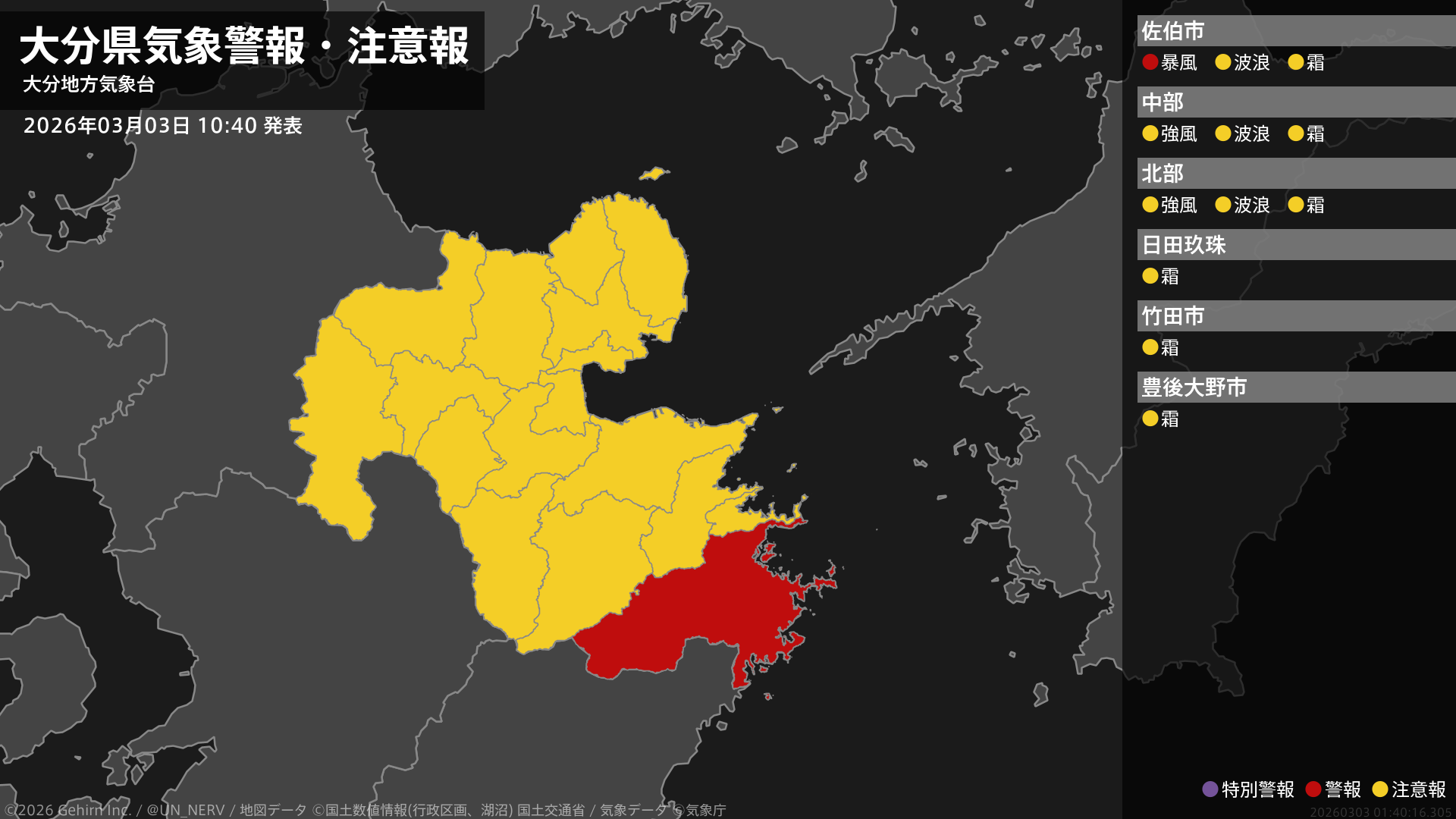 【大分県 気象警報・注意報 2026年03月03日 10:40】南部の海上では、3日夕方から3日夜遅くまで暴風に警戒してください。#気象警報注意報 #大分県