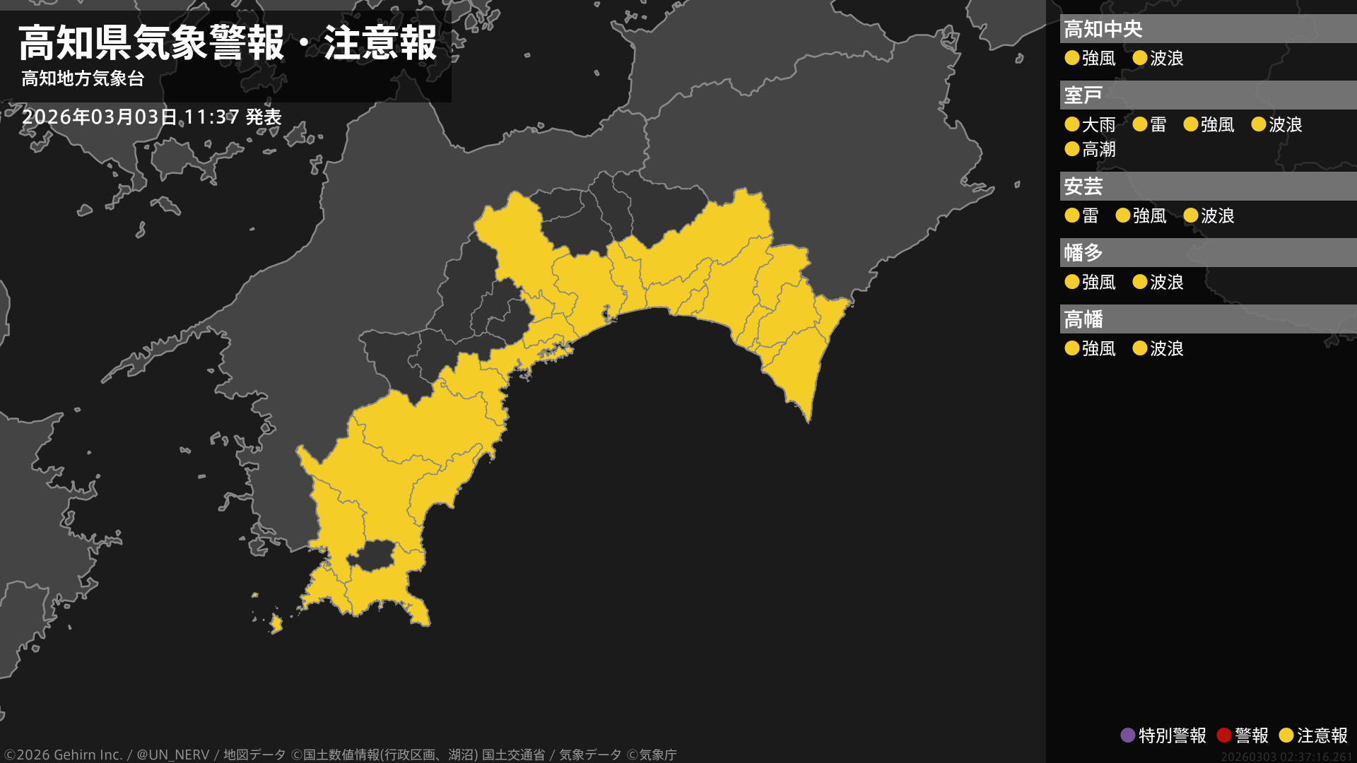 【高知県 気象警報・注意報 2026年03月03日 11:37】東部では、低い土地の浸水や高潮、落雷に注意してください。高知県では、強風や高波に注意してください。#気象警報注意報 #高知県
