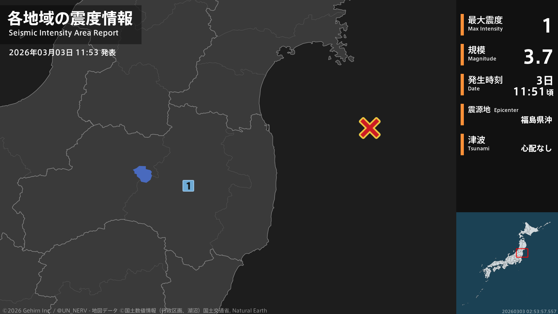 【地震情報 2026年3月3日】11時51分頃、福島県沖を震源とする地震がありました。震源の深さは約70km、地震の規模はM3.7、最大震度1を福島県で観測しています。この地震による津波の心配はありません。#地震 #福島県