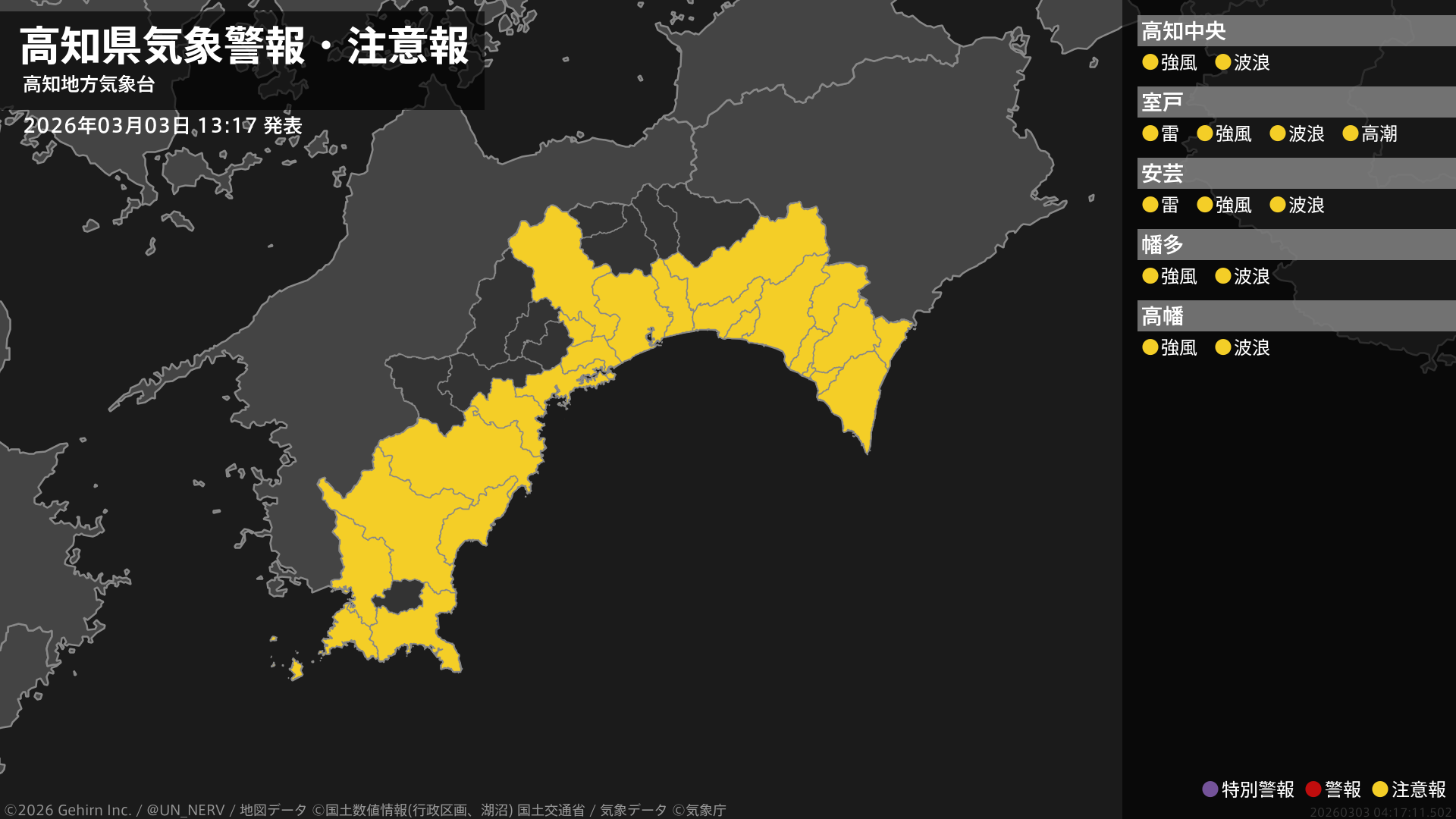 【高知県 気象警報・注意報 2026年03月03日 13:17】高知県では、強風や高波に注意してください。東部では、高潮や急な強い雨、落雷に注意してください。#気象警報注意報 #高知県