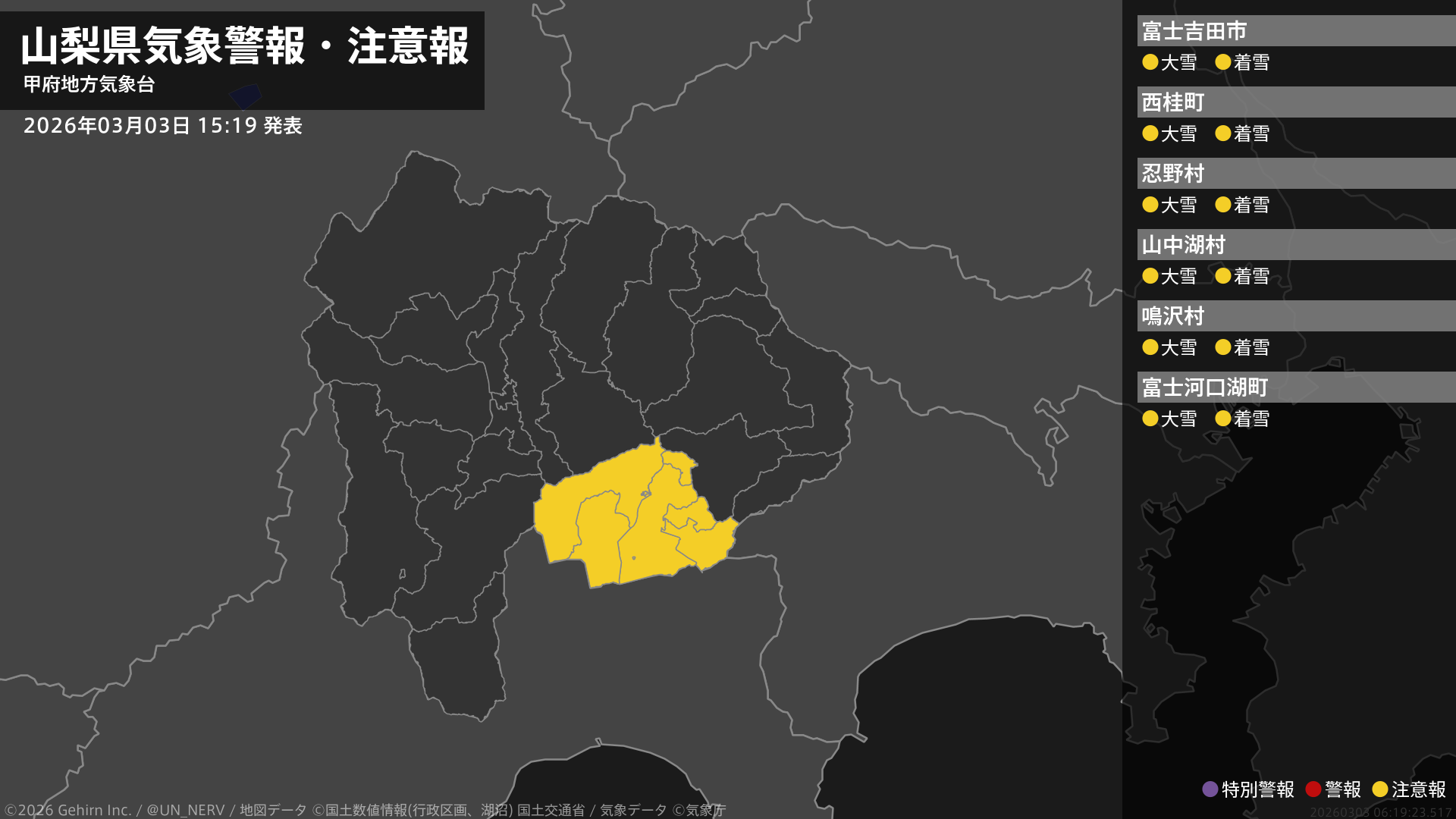 【山梨県 気象警報・注意報 2026年03月03日 15:19】東部・富士五湖では、4日明け方まで大雪や電線等への着雪に注意してください。#気象警報注意報 #山梨県