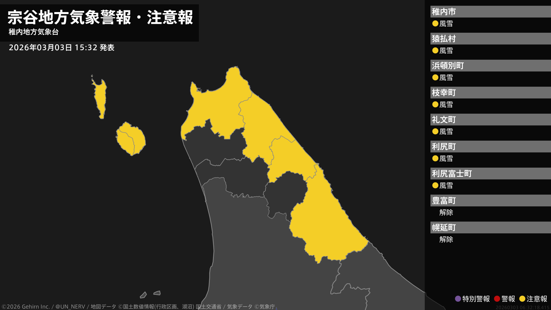 【宗谷地方 気象警報・注意報 2026年03月03日 15:32】宗谷地方では、風雪に注意してください。#気象警報注意報 #宗谷地方