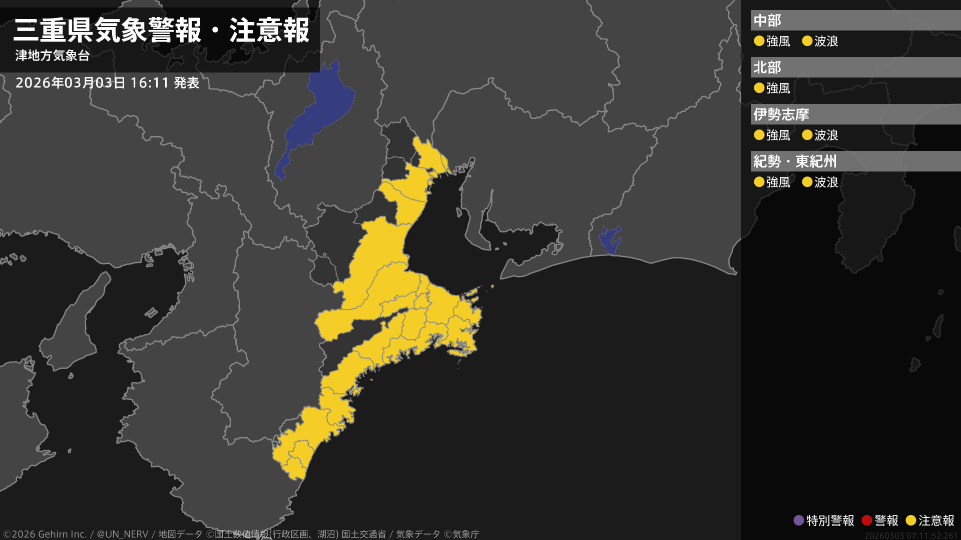 【三重県 気象警報・注意報 2026年03月03日 16:11】