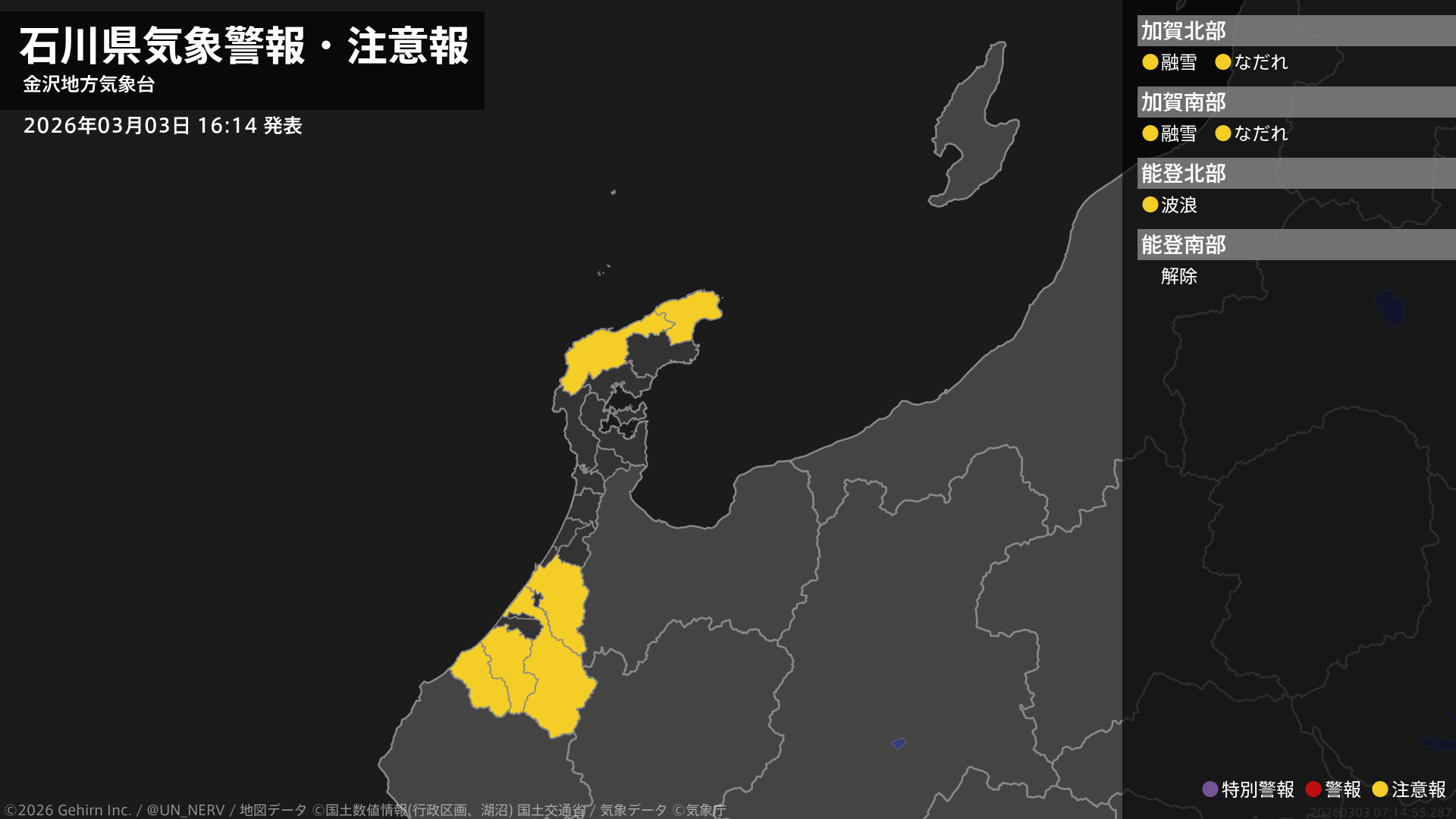 【石川県 気象警報・注意報 2026年03月03日 16:14】
