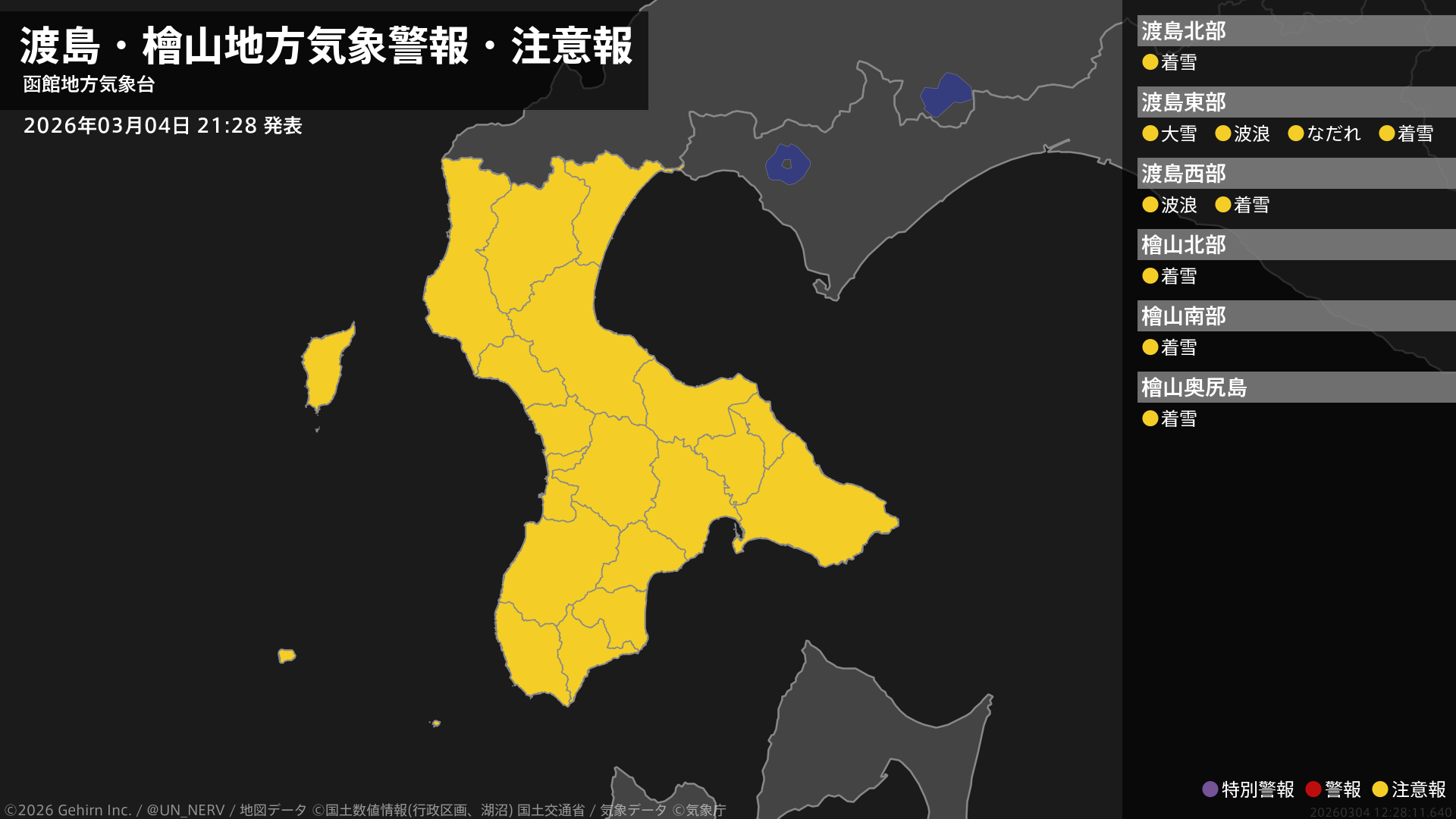 【渡島・檜山地方 気象警報・注意報 2026年03月04日 21:28】渡島地方では、大雪や高波、なだれに注意してください。渡島、檜山地方では、電線等への着雪に注意してください。#気象警報注意報 #渡島地方 #檜山地方