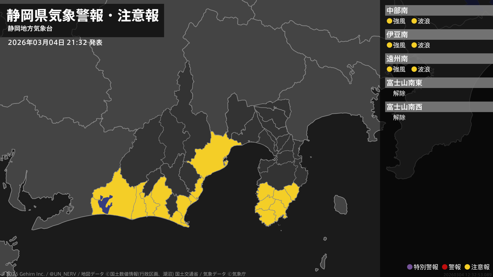 【静岡県 気象警報・注意報 2026年03月04日 21:32】伊豆では5日明け方まで、中部、西部では5日夕方まで、強風に注意してください。中部、伊豆、西部では、5日昼前まで高波に注意してください。#気象警報注意報 #静岡県