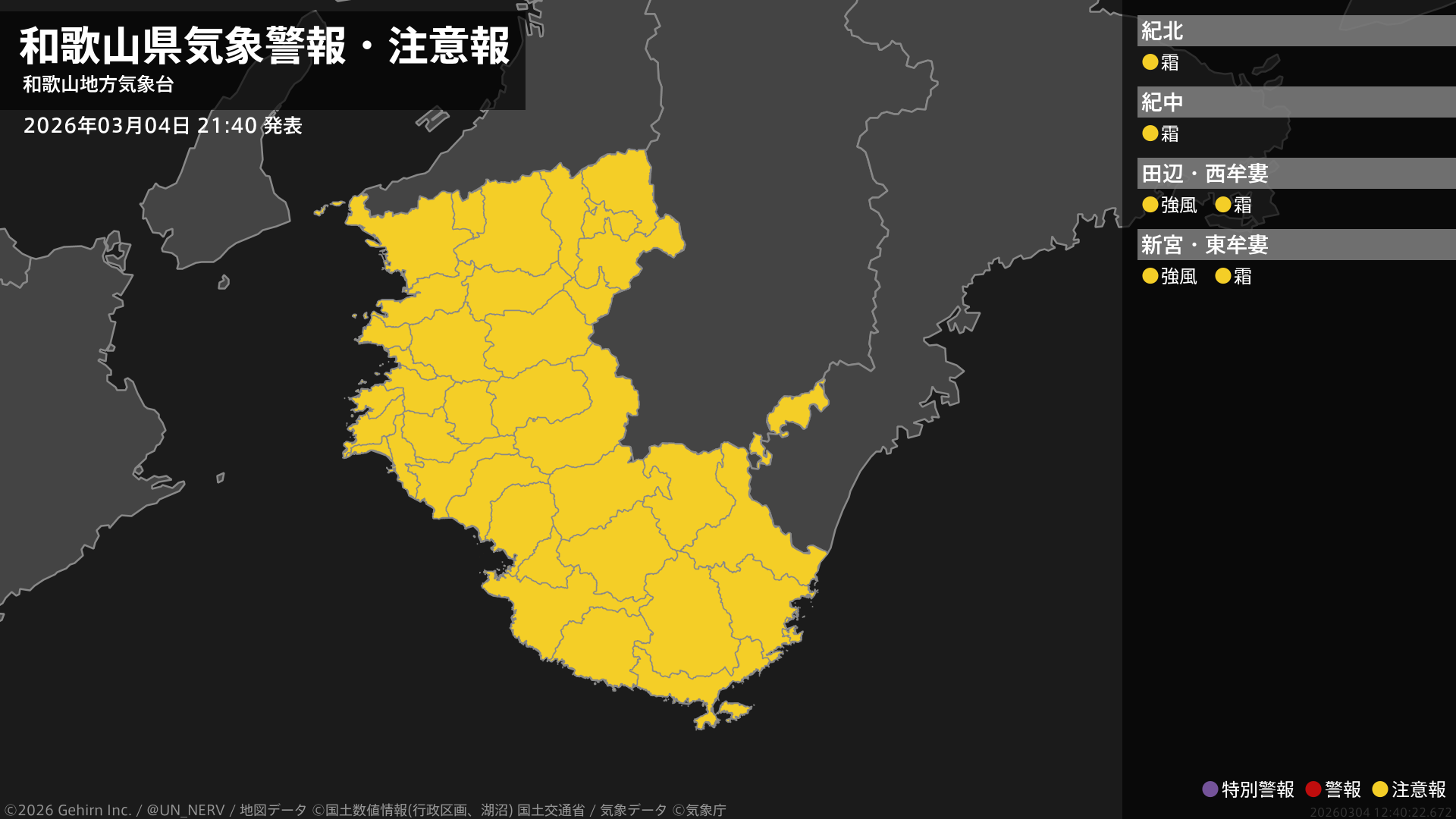 【和歌山県 気象警報・注意報 2026年03月04日 21:40】南部では、5日夕方まで強風に注意してください。和歌山県では、5日朝は霜に対する農作物の管理に注意してください。#気象警報注意報 #和歌山県