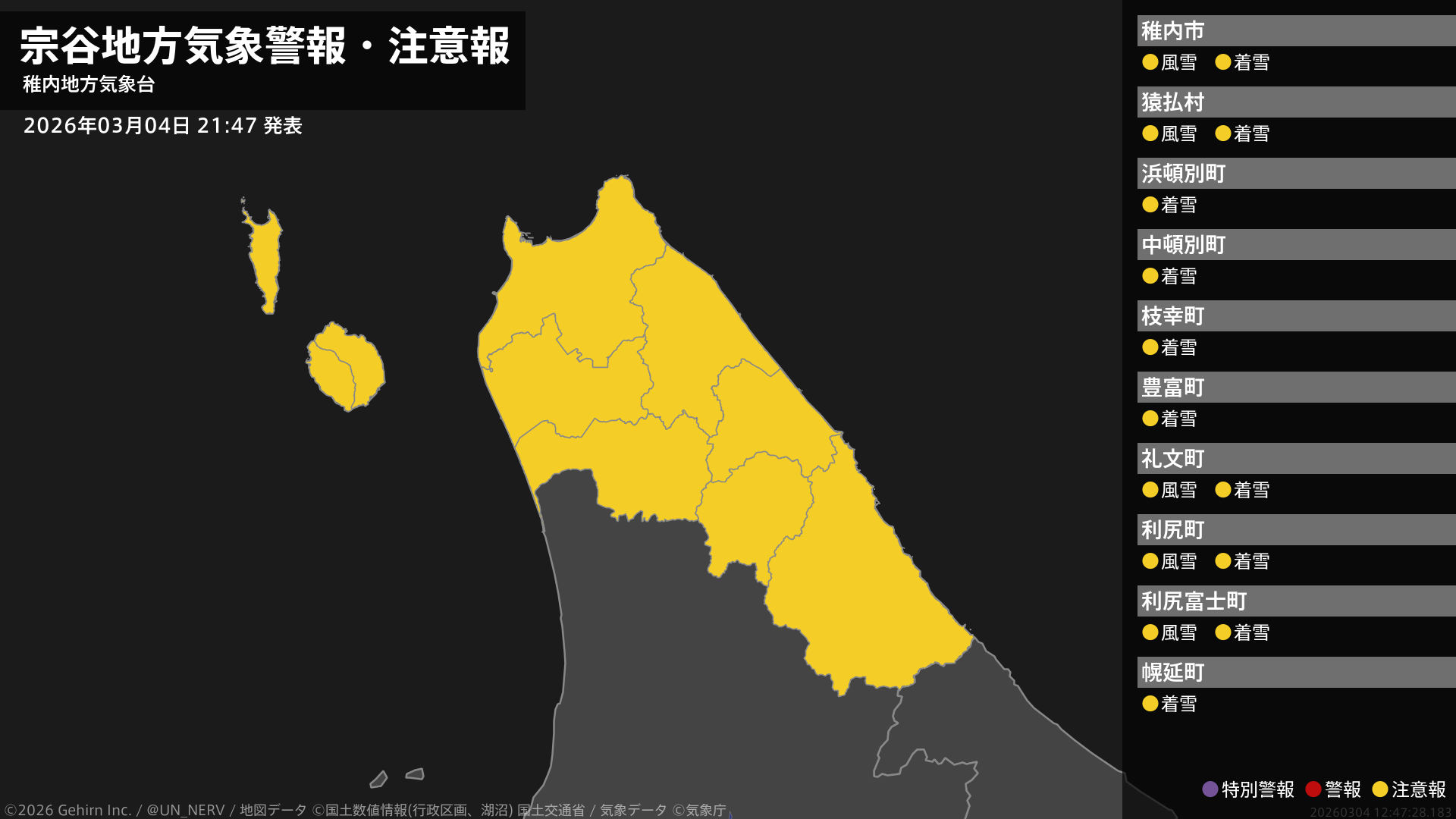 【宗谷地方 気象警報・注意報 2026年03月04日 21:47】宗谷地方では、5日昼前まで風雪に、5日明け方まで電線等への着雪に注意してください。#気象警報注意報 #宗谷地方