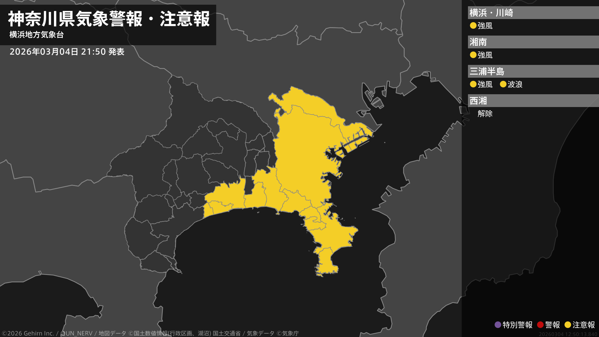 【神奈川県 気象警報・注意報 2026年03月04日 21:50】東部では、5日昼前まで強風に、5日明け方まで高波に注意してください。#気象警報注意報 #神奈川県