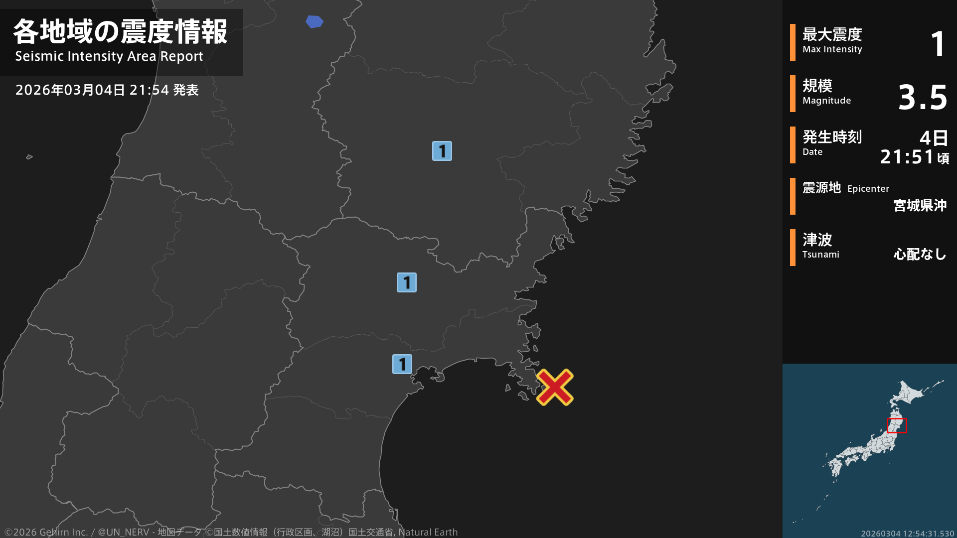 【地震情報 2026年3月4日】21時51分頃、宮城県沖を震源とする地震がありました。震源の深さは約60km、地震の規模はM3.5、最大震度1を岩手県、宮城県で観測しています。この地震による津波の心配はありません。#地震 #岩手県 #宮城県