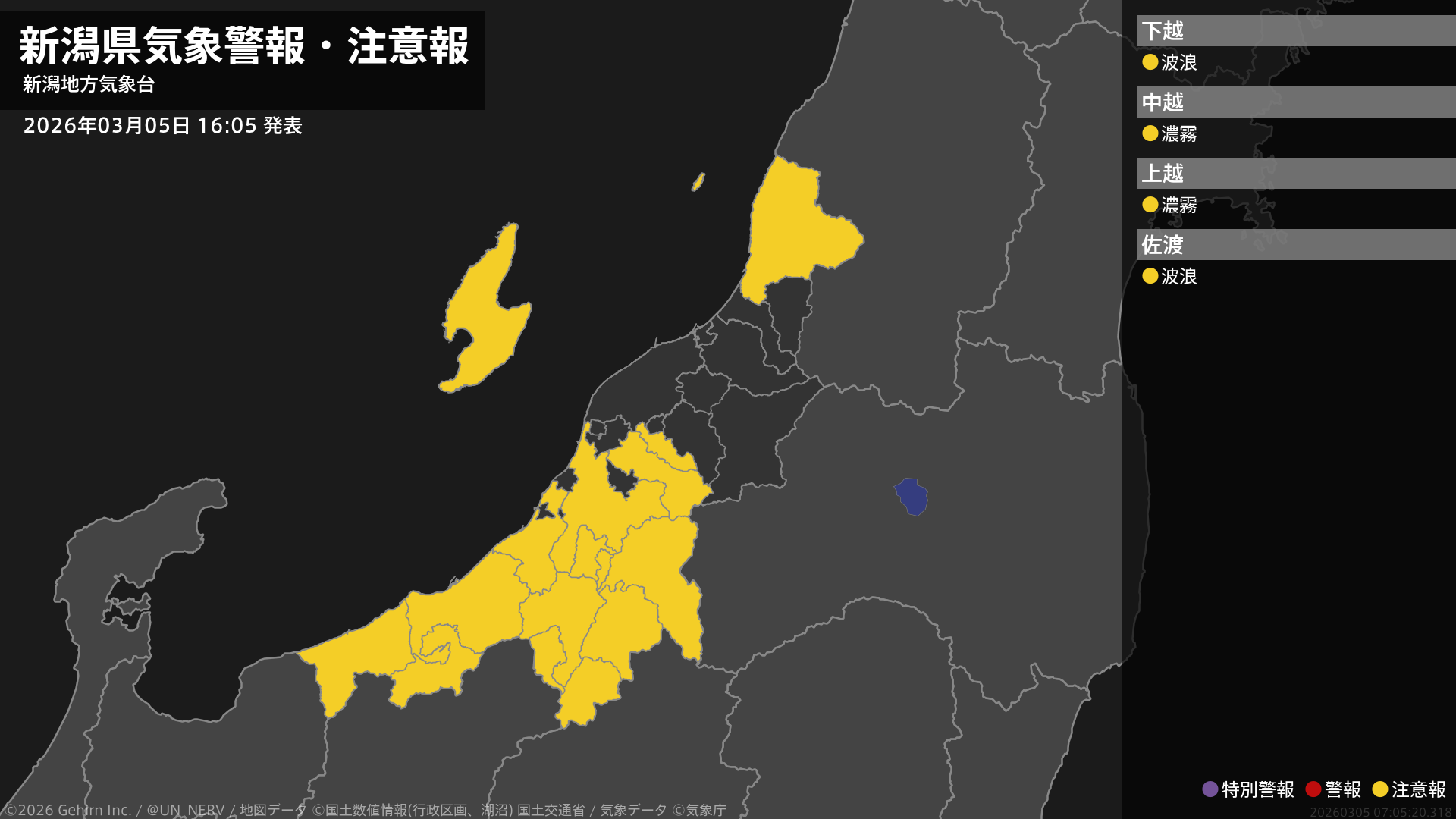【新潟県 気象警報・注意報 2026年03月05日 16:05】下越、佐渡では、5日夜遅くまで高波に注意してください。中越、上越では、6日未明から6日昼前まで濃霧による視程障害に注意してください。#気象警報注意報 #新潟県