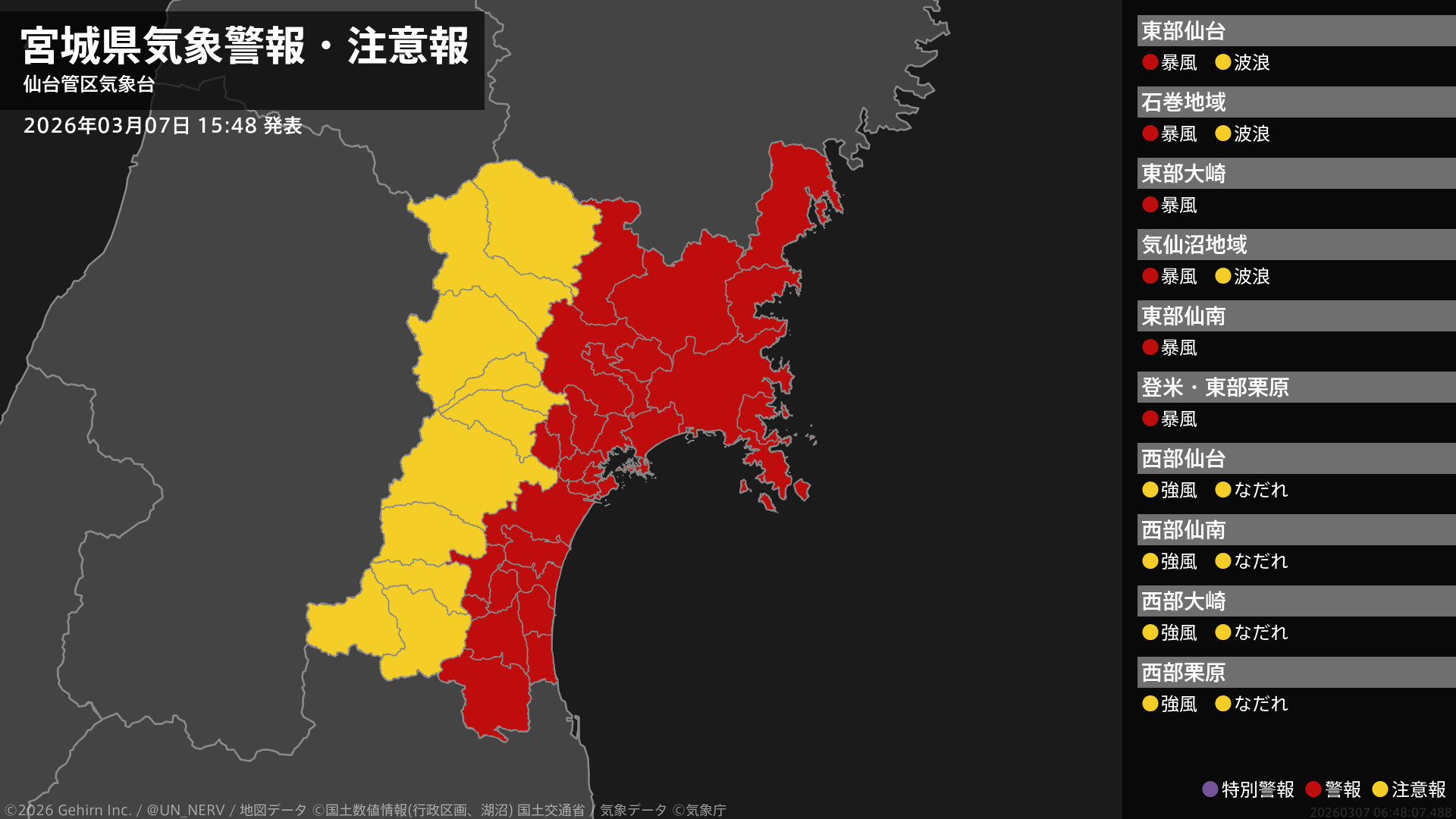 【宮城県 気象警報・注意報 2026年03月07日 15:48】