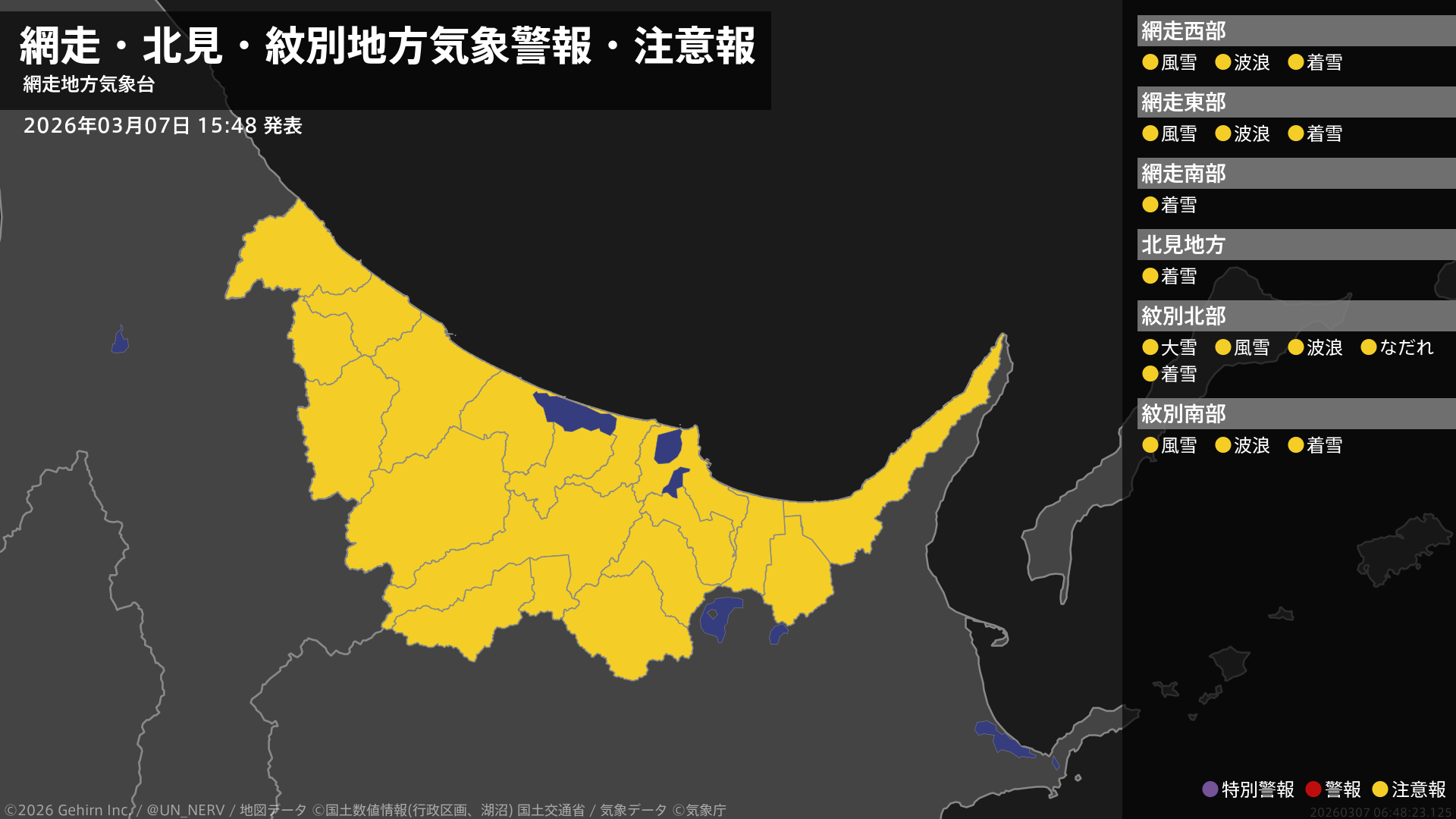【網走・北見・紋別地方 気象警報・注意報 2026年03月07日 15:48】
