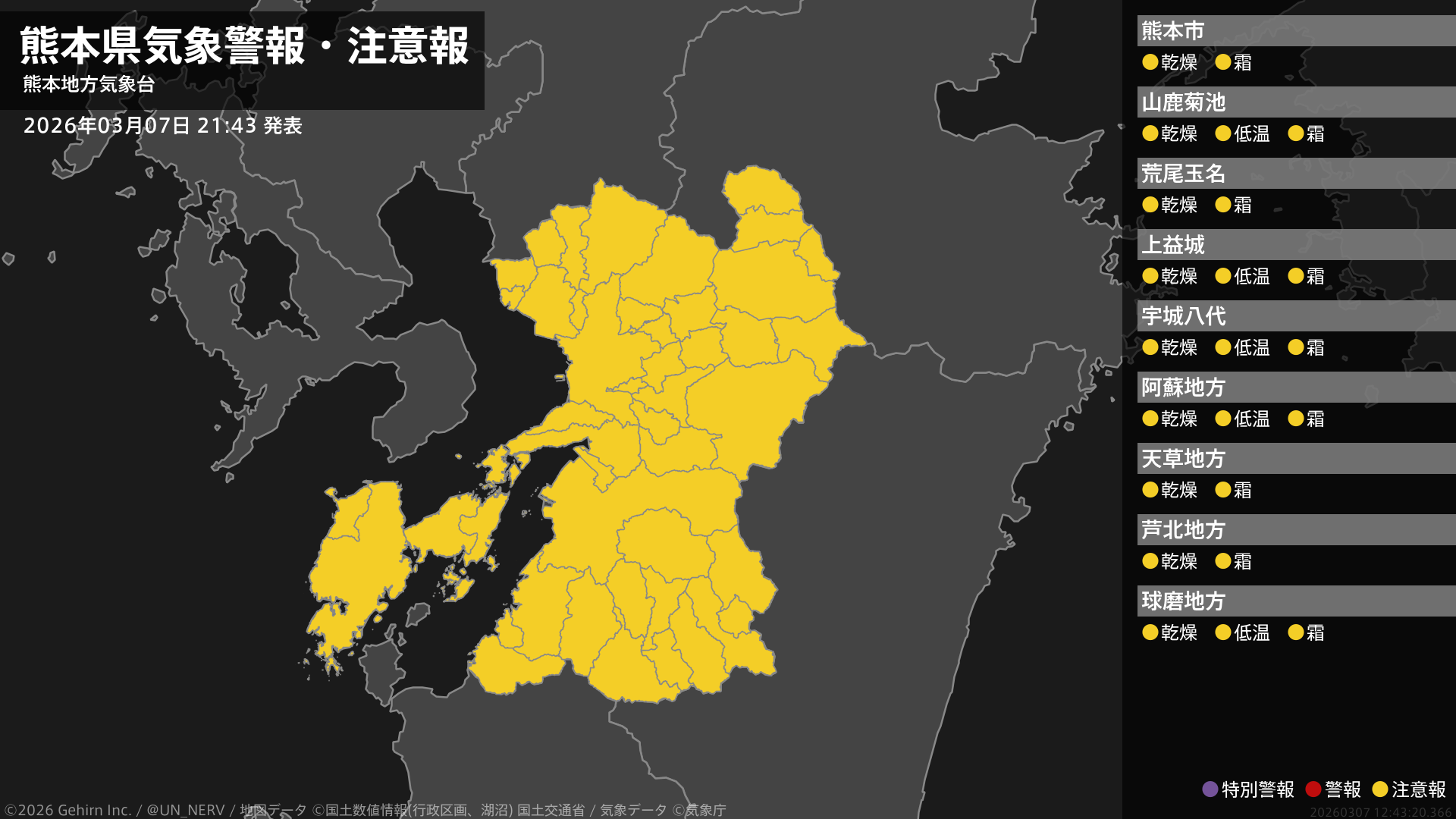 【熊本県 気象警報・注意報 2026年03月07日 21:43】熊本県では、9日まで空気の乾燥した状態が続くため、火の取り扱いに、8日朝は霜に対する農作物の管理に注意してください。熊本、阿蘇、球磨地方では、8日まで低温に注意してください。#気象警報注意報 #熊本県