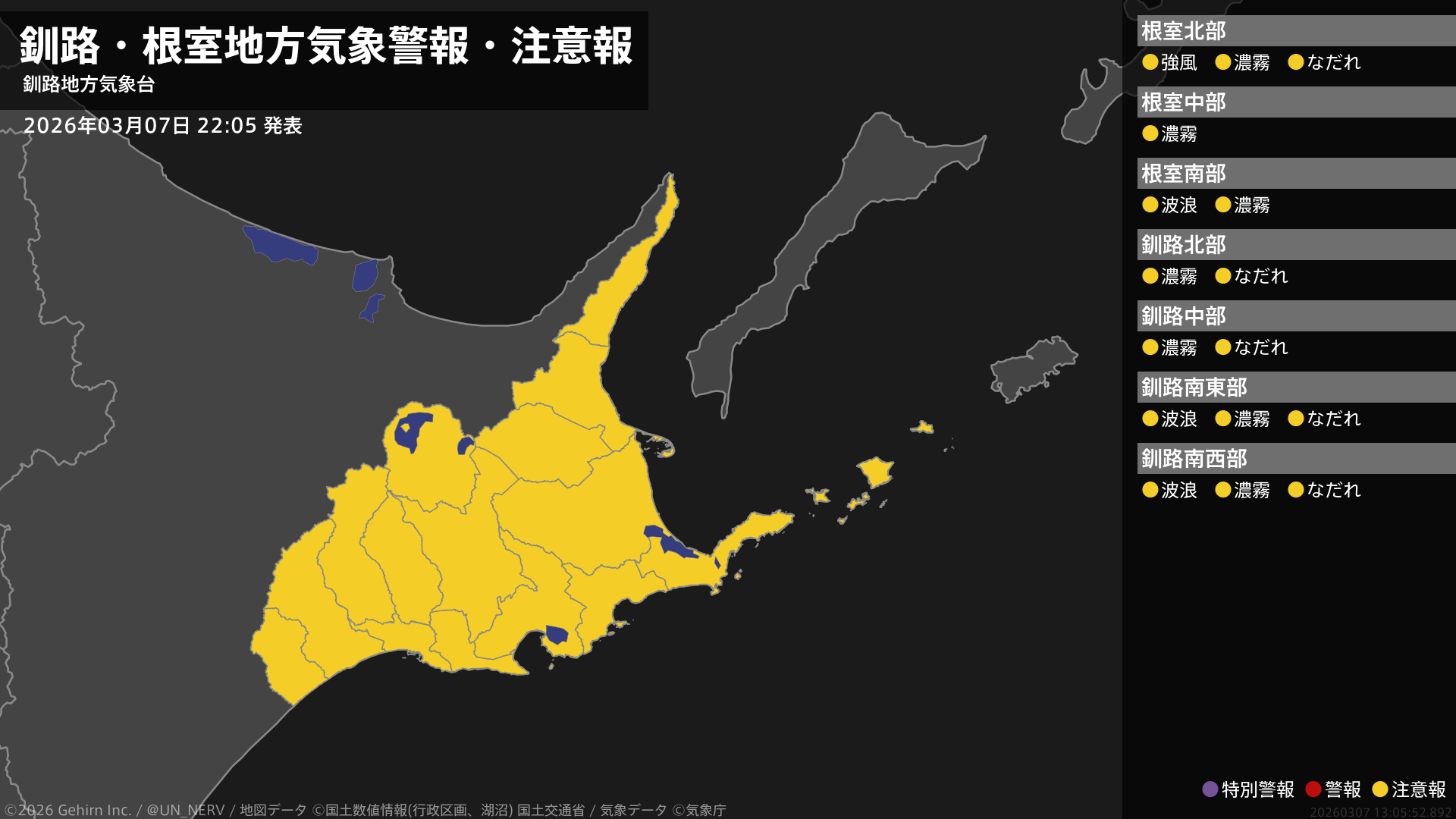 【釧路・根室地方 気象警報・注意報 2026年03月07日 22:05】根室地方では、8日明け方から8日夜遅くまで強風に注意してください。根室、釧路地方では、8日夕方まで高波に、8日昼前まで濃霧による視程障害に、8日までなだれに注意してください。#気象警報注意報 #根室地方 #釧路地方