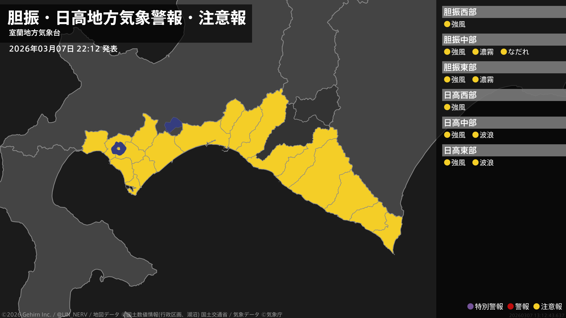 【胆振・日高地方 気象警報・注意報 2026年03月07日 22:12】胆振、日高地方では、強風に注意してください。日高地方では、高波に注意してください。胆振地方では、濃霧による視程障害やなだれに注意してください。#気象警報注意報 #胆振地方 #日高地方