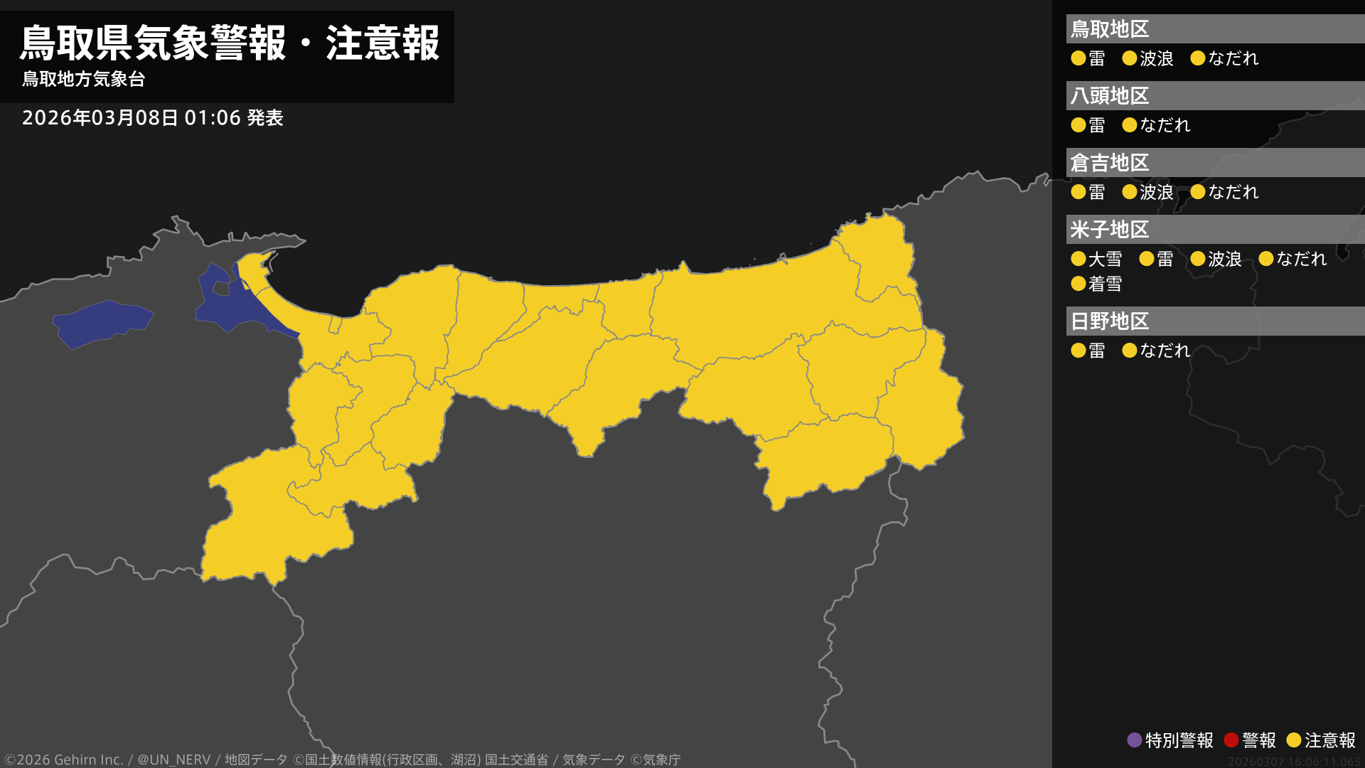 【鳥取県 気象警報・注意報 2026年03月08日 01:06】中・西部では、8日明け方まで大雪や電線等への着雪に注意してください。鳥取県では、8日夕方まで高波に、8日明け方まで急な強い雨や落雷に、9日までなだれに注意してください。#気象警報注意報 #鳥取県