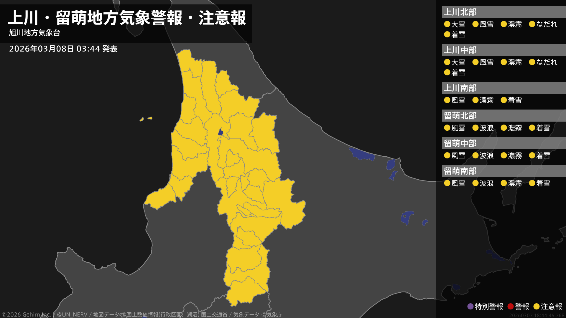 【上川・留萌地方 気象警報・注意報 2026年03月08日 03:44】上川、留萌地方では、風雪や濃霧による視程障害、電線等への着雪に注意してください。上川地方では、大雪やなだれに注意してください。留萌地方では、高波に注意してください。#気象警報注意報 #上川地方 #留萌地方