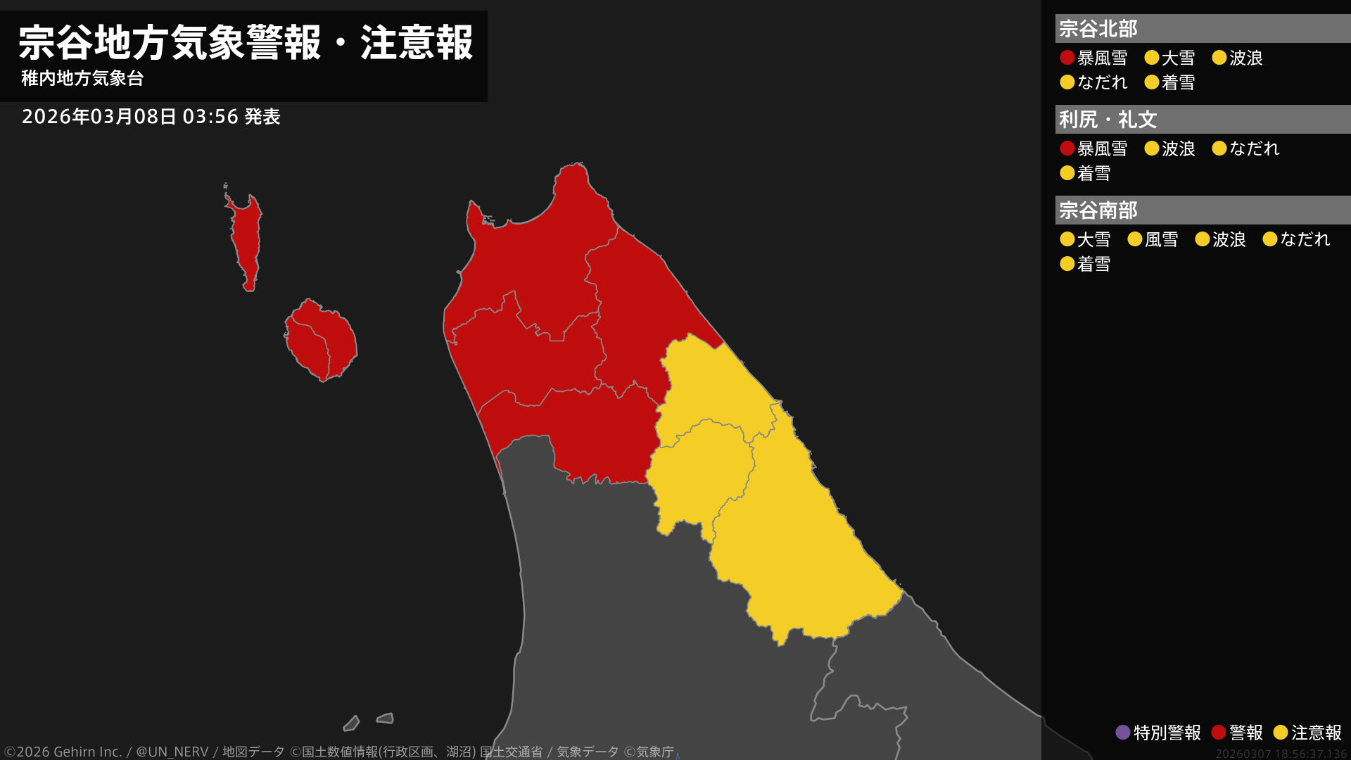 【宗谷地方 気象警報・注意報 2026年03月08日 03:56】宗谷地方では、8日昼前まで暴風雪に警戒してください。#気象警報注意報 #宗谷地方