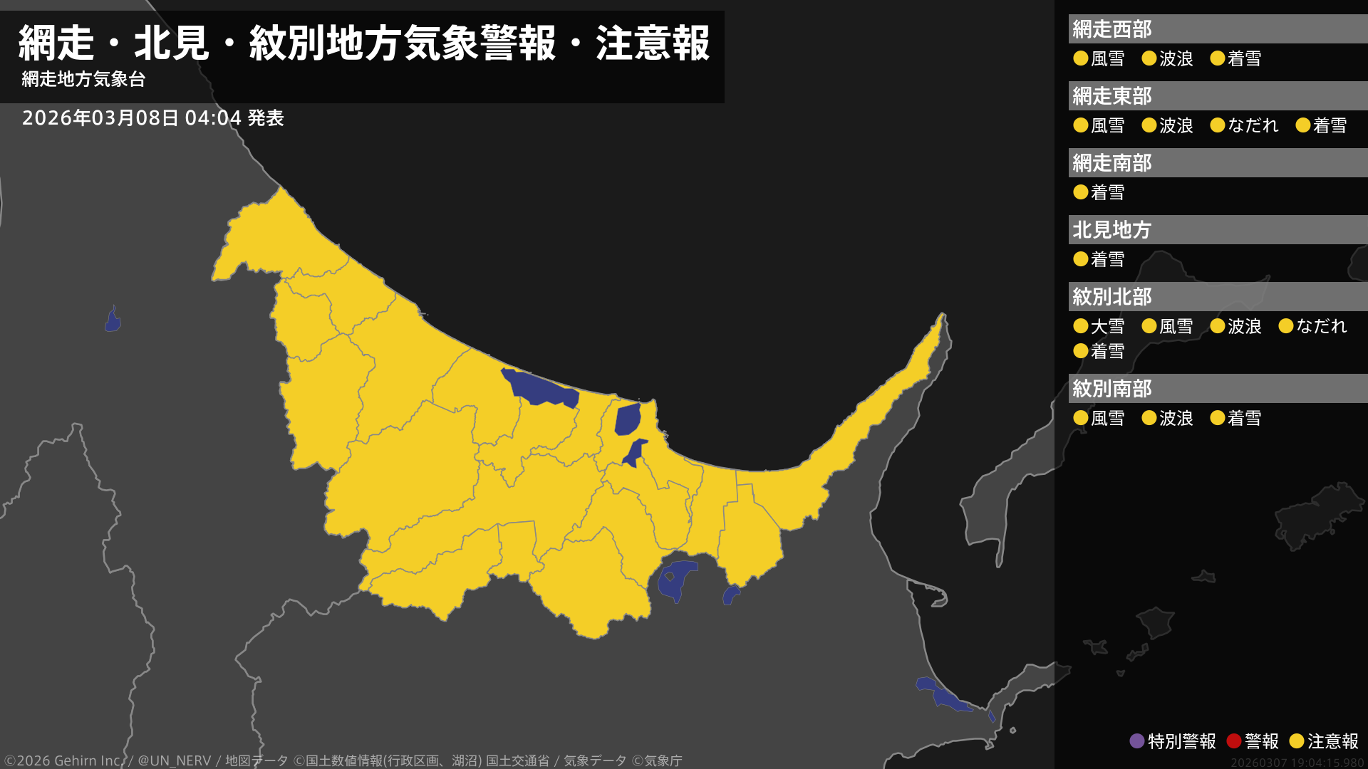 【網走・北見・紋別地方 気象警報・注意報 2026年03月08日 04:04】網走、紋別地方では、風雪や高波、なだれに注意してください。紋別地方では、大雪に注意してください。網走、北見、紋別地方では、電線等への着雪に注意してください。#気象警報注意報 #網走・北見・紋別地方