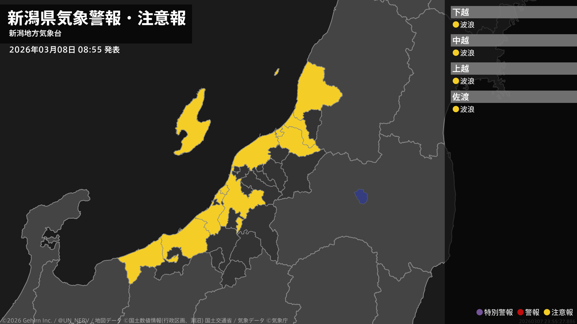 【新潟県 気象警報・注意報 2026年03月08日 08:55】中越、上越では9日明け方まで、下越、佐渡では9日朝まで、高波に注意してください。#気象警報注意報 #新潟県