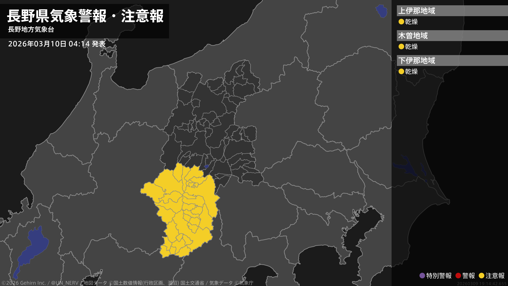 【長野県 気象警報・注意報 2026年03月10日 04:14】南部では、11日まで空気の乾燥した状態が続くため、火の取り扱いに注意してください。#気象警報注意報 #長野県