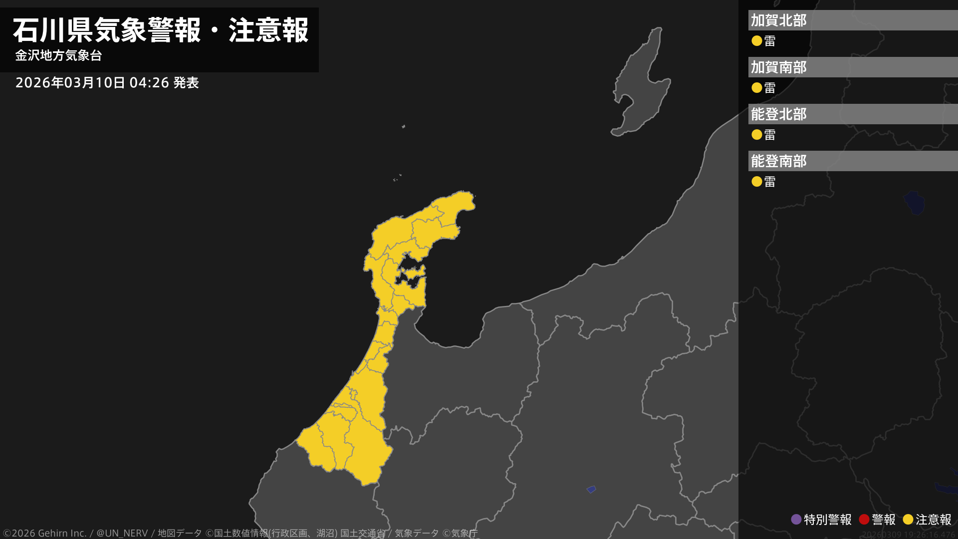 【石川県 気象警報・注意報 2026年03月10日 04:26】石川県では、10日朝まで急な強い雨や落雷に注意してください。#気象警報注意報 #石川県