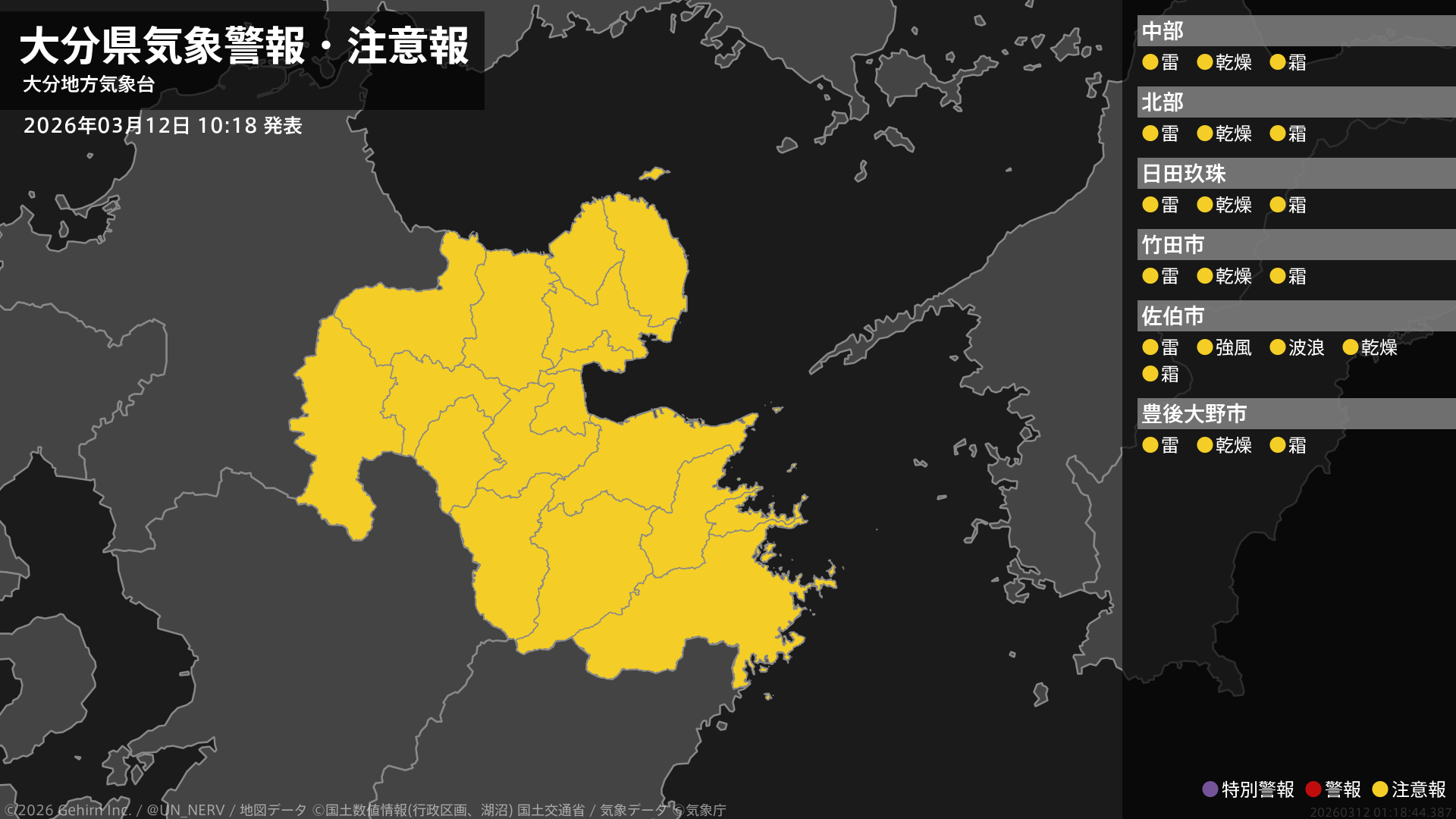 【大分県 気象警報・注意報 2026年03月12日 10:18】南部では、強風や高波に注意してください。大分県では、竜巻などの激しい突風や急な強い雨、落雷、乾燥、霜に対する農作物の管理に注意してください。#気象警報注意報 #大分県