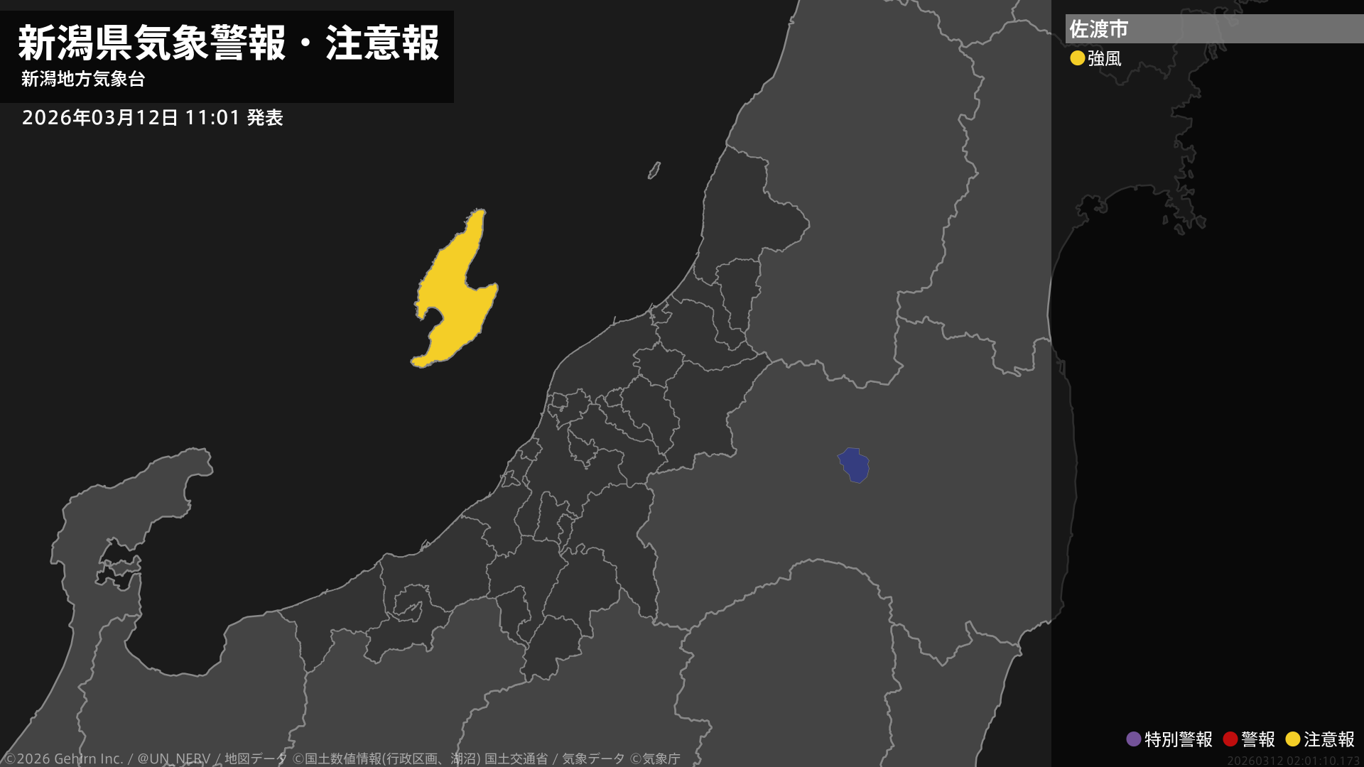 【新潟県 気象警報・注意報 2026年03月12日 11:01】佐渡では、12日夕方まで強風に注意してください。#気象警報注意報 #新潟県