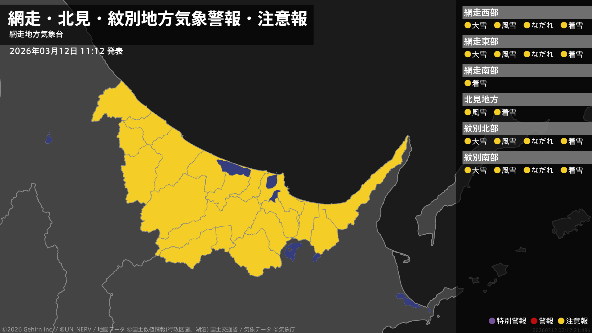 【網走・北見・紋別地方 気象警報・注意報 2026年03月12日 11:12】網走、北見、紋別地方では、風雪や電線等への着雪に注意してください。網走、紋別地方では、大雪やなだれに注意してください。#気象警報注意報 #網走・北見・紋別地方