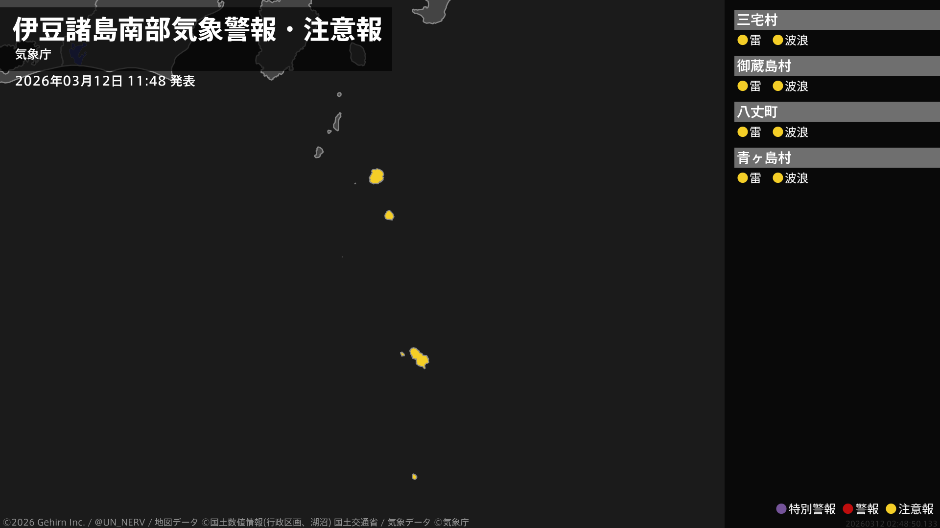 【東京都 気象警報・注意報 2026年03月12日 11:48】伊豆諸島北部、伊豆諸島南部、小笠原諸島では高波に、伊豆諸島南部では急な強い雨や落雷に、東京地方では空気の乾燥した状態が続くため、火の取り扱いに注意してください。#気象警報注意報 #東京都