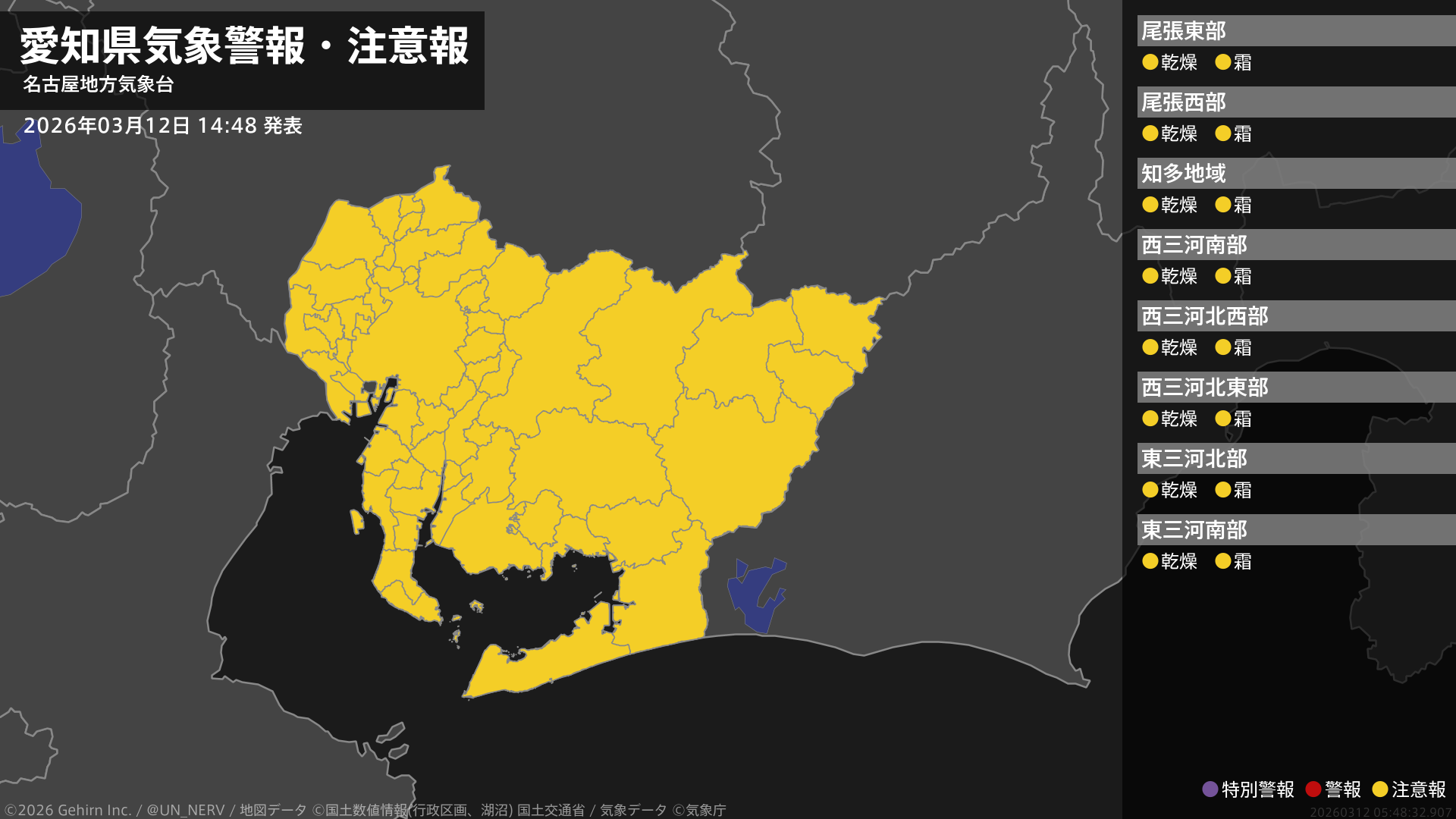 【愛知県 気象警報・注意報 2026年03月12日 14:48】愛知県では、14日まで空気の乾燥した状態が続くため、火の取り扱いに、13日朝は霜に対する農作物の管理に注意してください。#気象警報注意報 #愛知県