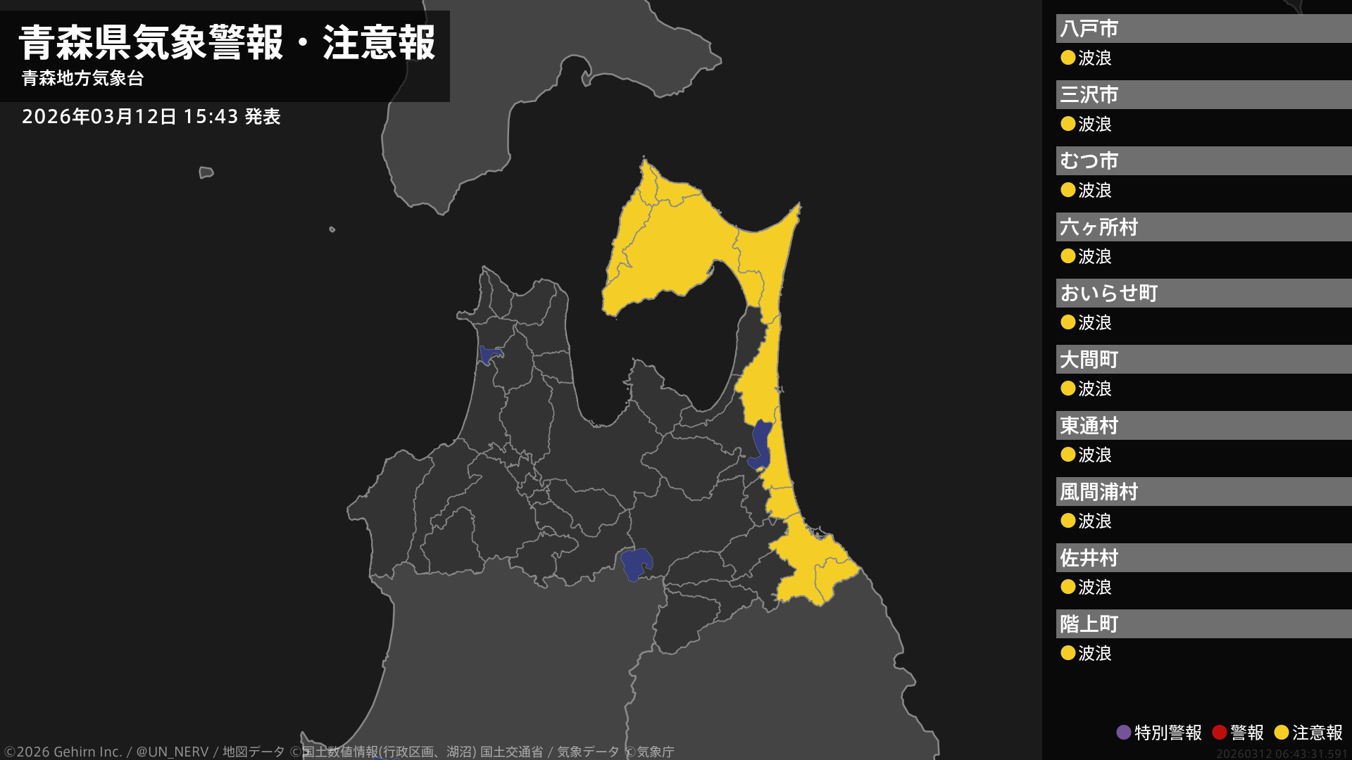 【青森県 気象警報・注意報 2026年03月12日 15:43】下北、三八上北では、高波に注意してください。#気象警報注意報 #青森県
