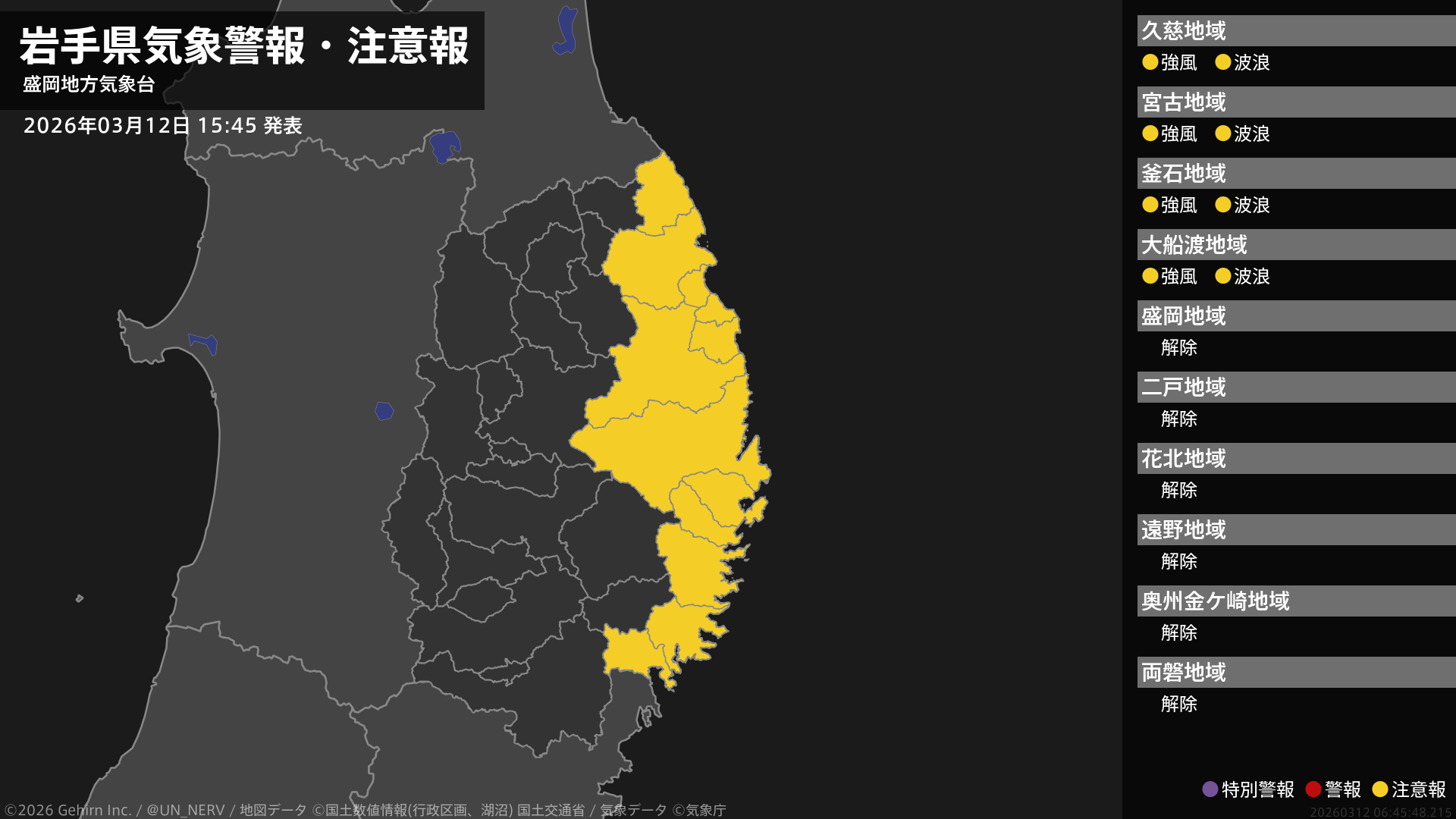 【岩手県 気象警報・注意報 2026年03月12日 15:45】沿岸北部、沿岸南部では、強風や高波に注意してください。#気象警報注意報 #岩手県