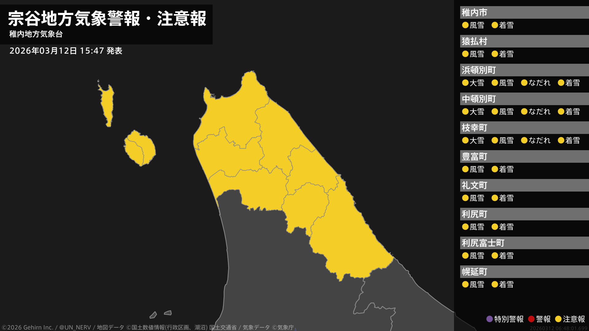 【宗谷地方 気象警報・注意報 2026年03月12日 15:48】宗谷地方では、風雪や大雪、なだれ、電線等への着雪に注意してください。#気象警報注意報 #宗谷地方