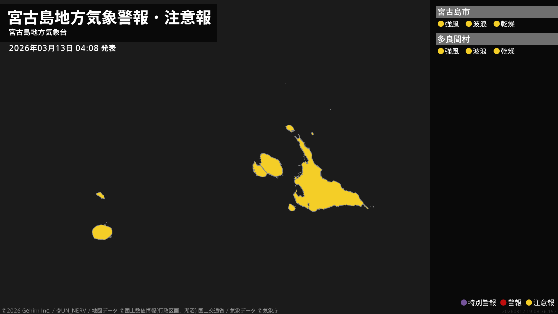 【宮古島地方 気象警報・注意報 2026年03月13日 04:08】宮古島地方では、強風や高波と、空気の乾燥した状態が続くため火の取り扱いに注意してください。#気象警報注意報 #宮古島地方
