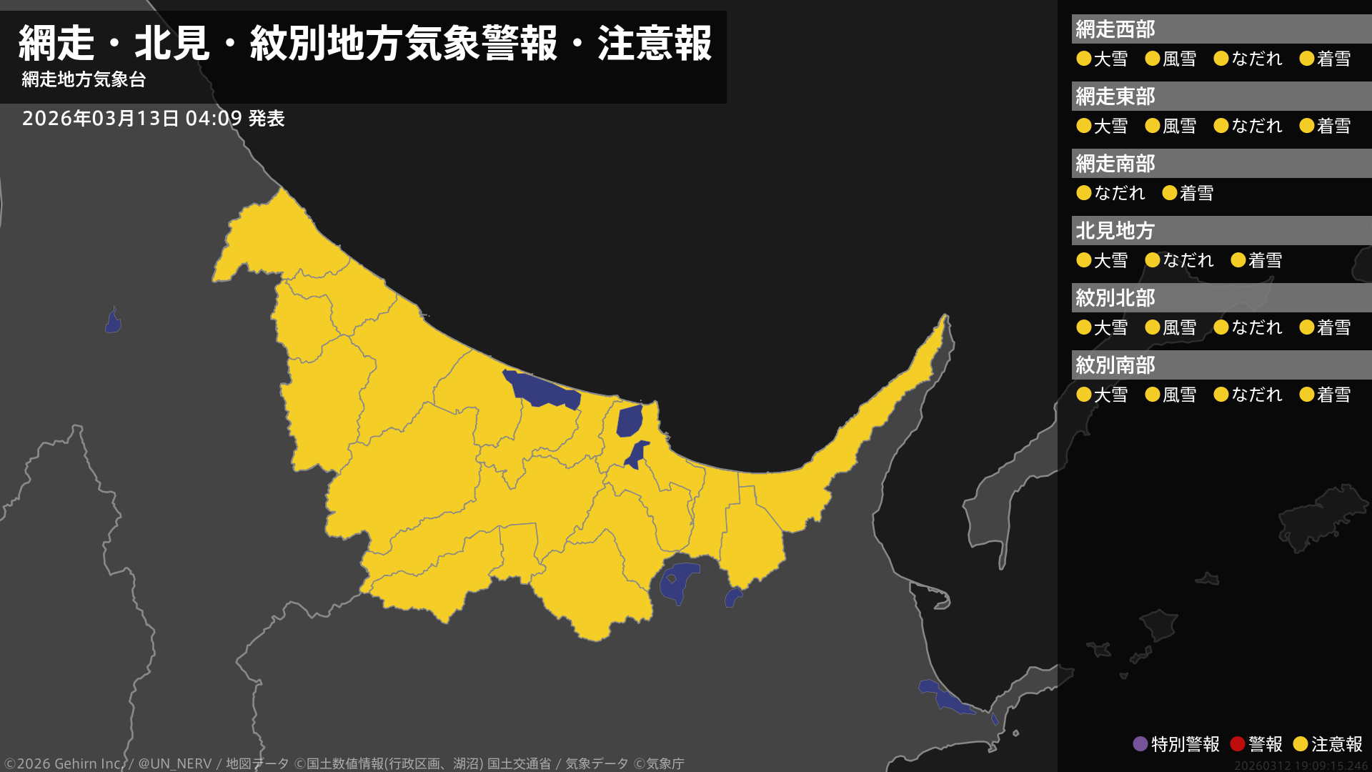 【網走・北見・紋別地方 気象警報・注意報 2026年03月13日 04:09】網走、紋別地方では、風雪に注意してください。網走、北見、紋別地方では、大雪やなだれ、電線等への着雪に注意してください。#気象警報注意報 #網走・北見・紋別地方
