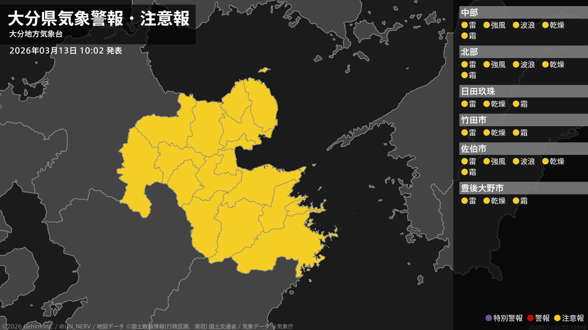 【大分県 気象警報・注意報 2026年03月13日 10:02】中部、北部、南部では、強風や高波に注意してください。大分県では、竜巻などの激しい突風や急な強い雨、落雷、乾燥、霜に対する農作物の管理に注意してください。#気象警報注意報 #大分県