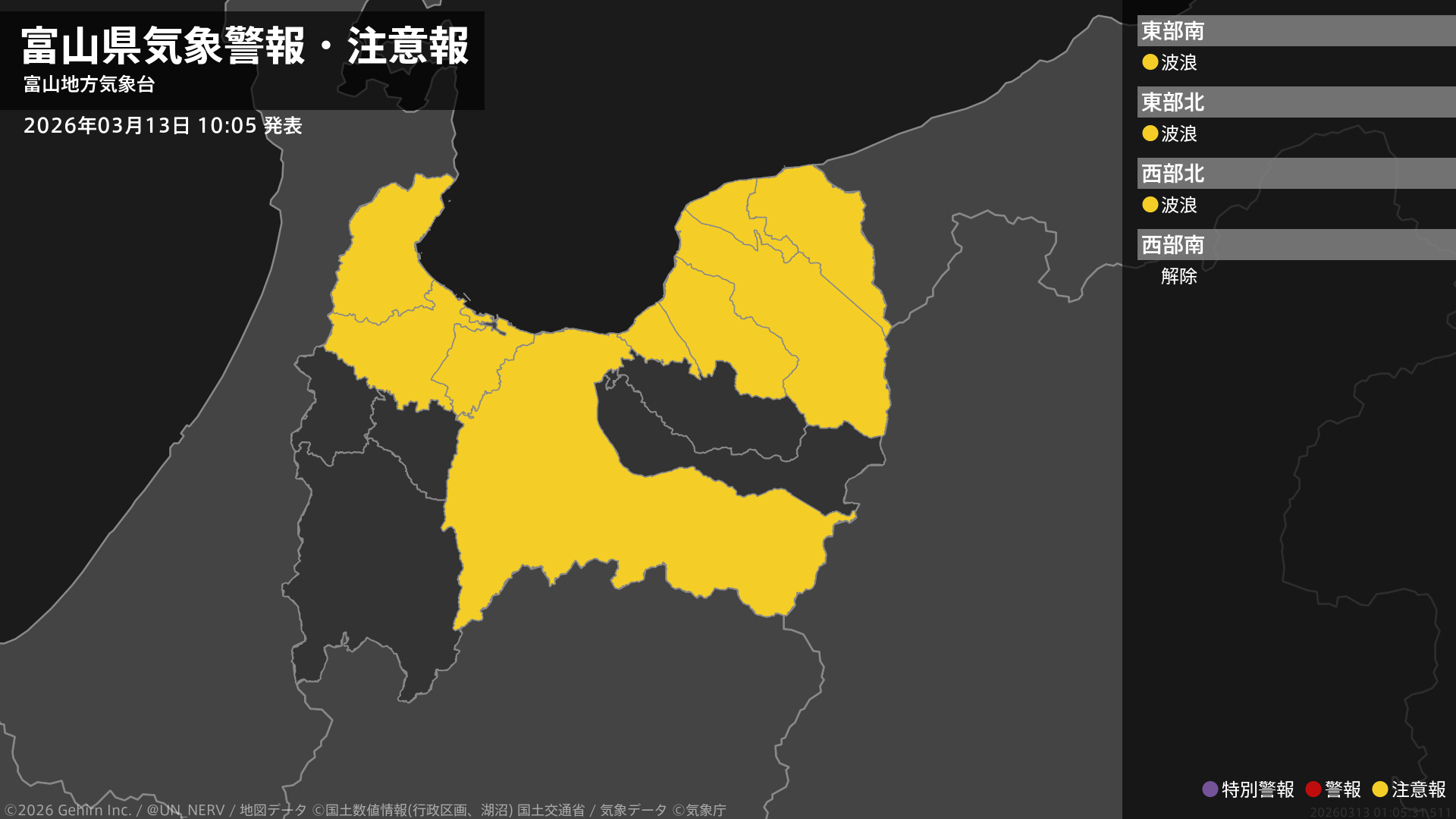 【富山県 気象警報・注意報 2026年03月13日 10:05】富山県では、高波に注意してください。#気象警報注意報 #富山県