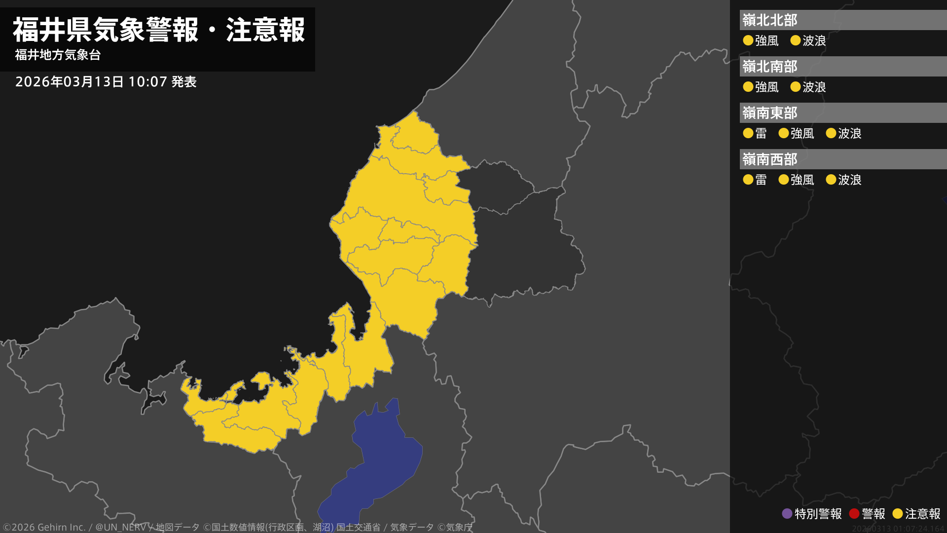 【福井県 気象警報・注意報 2026年03月13日 10:07】福井県では、強風や高波に注意してください。嶺南では、急な強い雨や落雷に注意してください。#気象警報注意報 #福井県
