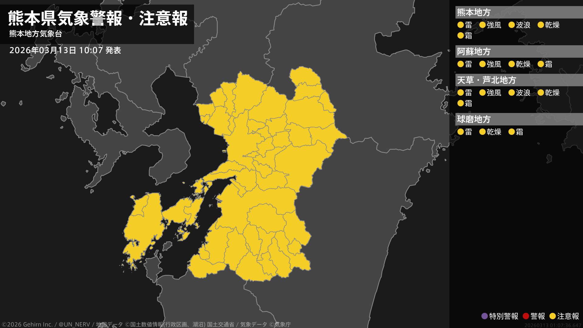 【熊本県 気象警報・注意報 2026年03月13日 10:07】熊本、阿蘇、天草・芦北地方では強風に、熊本、天草・芦北地方では高波に、熊本県では急な強い雨や落雷、乾燥、霜に対する農作物の管理に注意してください。#気象警報注意報 #熊本県