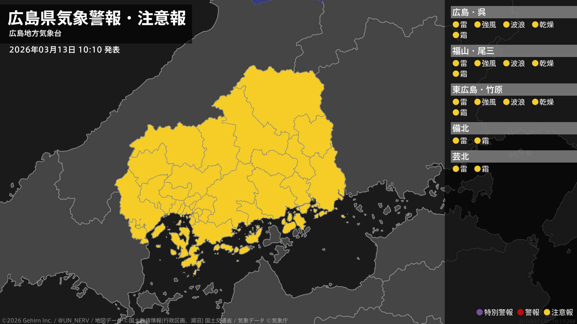 【広島県 気象警報・注意報 2026年03月13日 10:10】南部では、強風や高波と、空気の乾燥した状態が続くため火の取り扱いに注意してください。広島県では、急な強い雨や落雷、霜に対する農作物の管理に注意してください。#気象警報注意報 #広島県