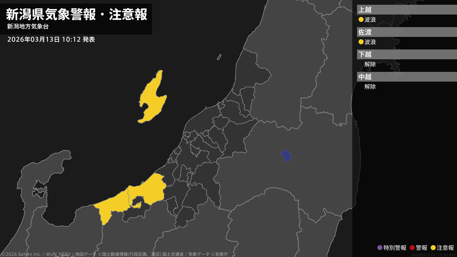 【新潟県 気象警報・注意報 2026年03月13日 10:12】上越、佐渡では、14日昼前まで高波に注意してください。#気象警報注意報 #新潟県