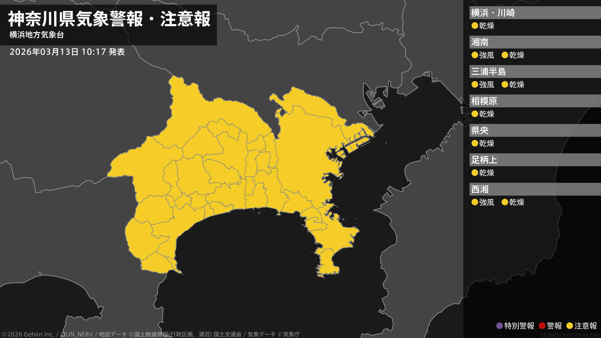 【神奈川県 気象警報・注意報 2026年03月13日 10:17】神奈川県では、13日夜のはじめ頃から強風に、14日まで空気の乾燥した状態が続くため、火の取り扱いに注意してください。#気象警報注意報 #神奈川県