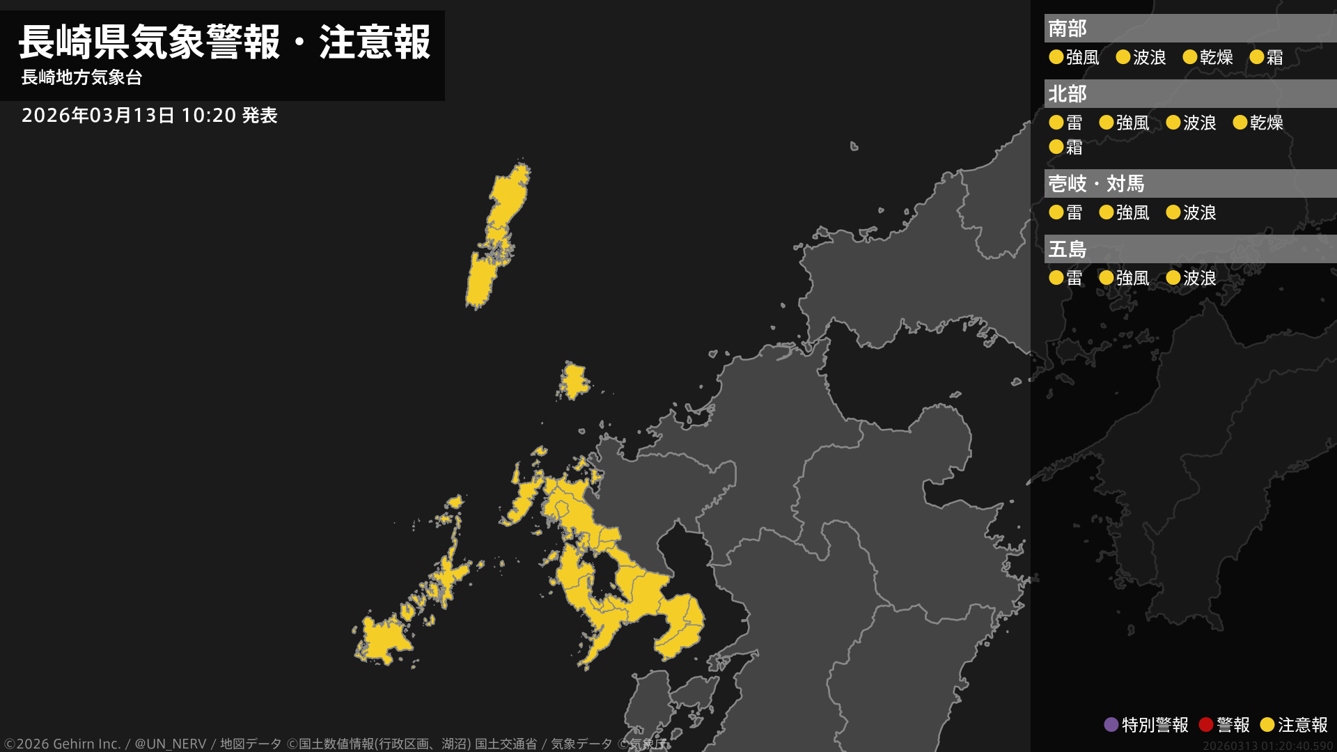 【長崎県 気象警報・注意報 2026年03月13日 10:20】長崎県では、強風や高波に注意してください。北部、壱岐・対馬、五島では、急な強い雨や落雷に注意してください。南部、北部では、乾燥や霜に対する農作物の管理に注意してください。#気象警報注意報 #長崎県