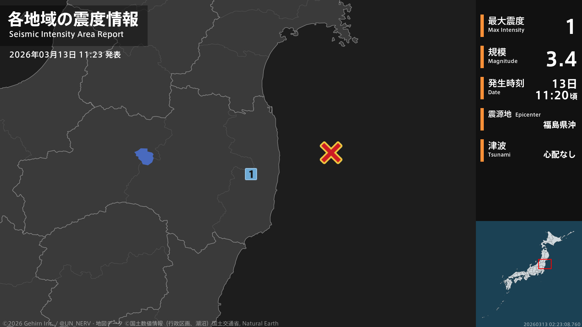 【地震情報 2026年3月13日】11時20分頃、福島県沖を震源とする地震がありました。震源の深さは約50km、地震の規模はM3.4、最大震度1を福島県で観測しています。この地震による津波の心配はありません。#地震 #福島県