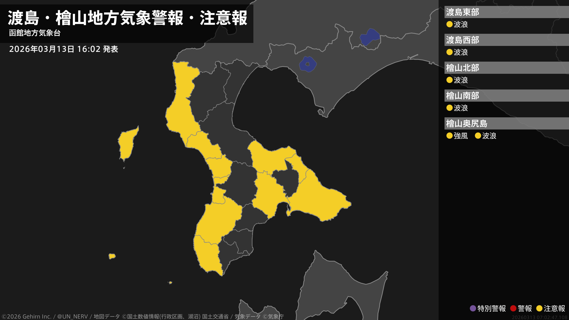 【渡島・檜山地方 気象警報・注意報 2026年03月13日 16:02】
