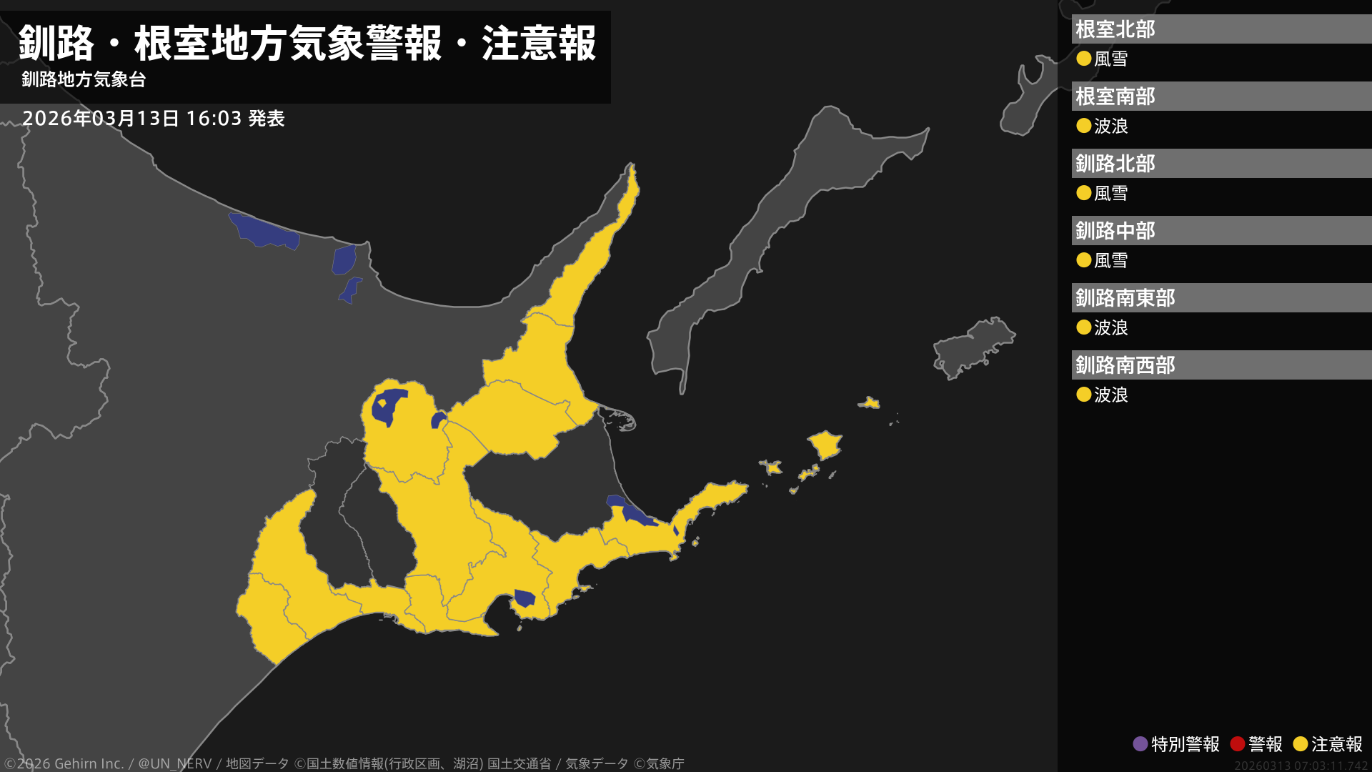 【釧路・根室地方 気象警報・注意報 2026年03月13日 16:03】
