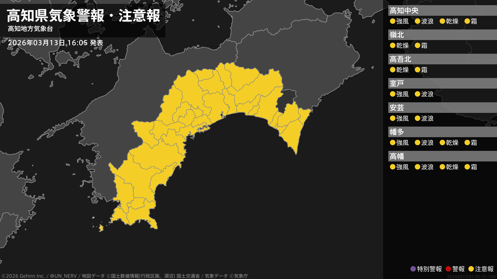【高知県 気象警報・注意報 2026年03月13日 16:05】