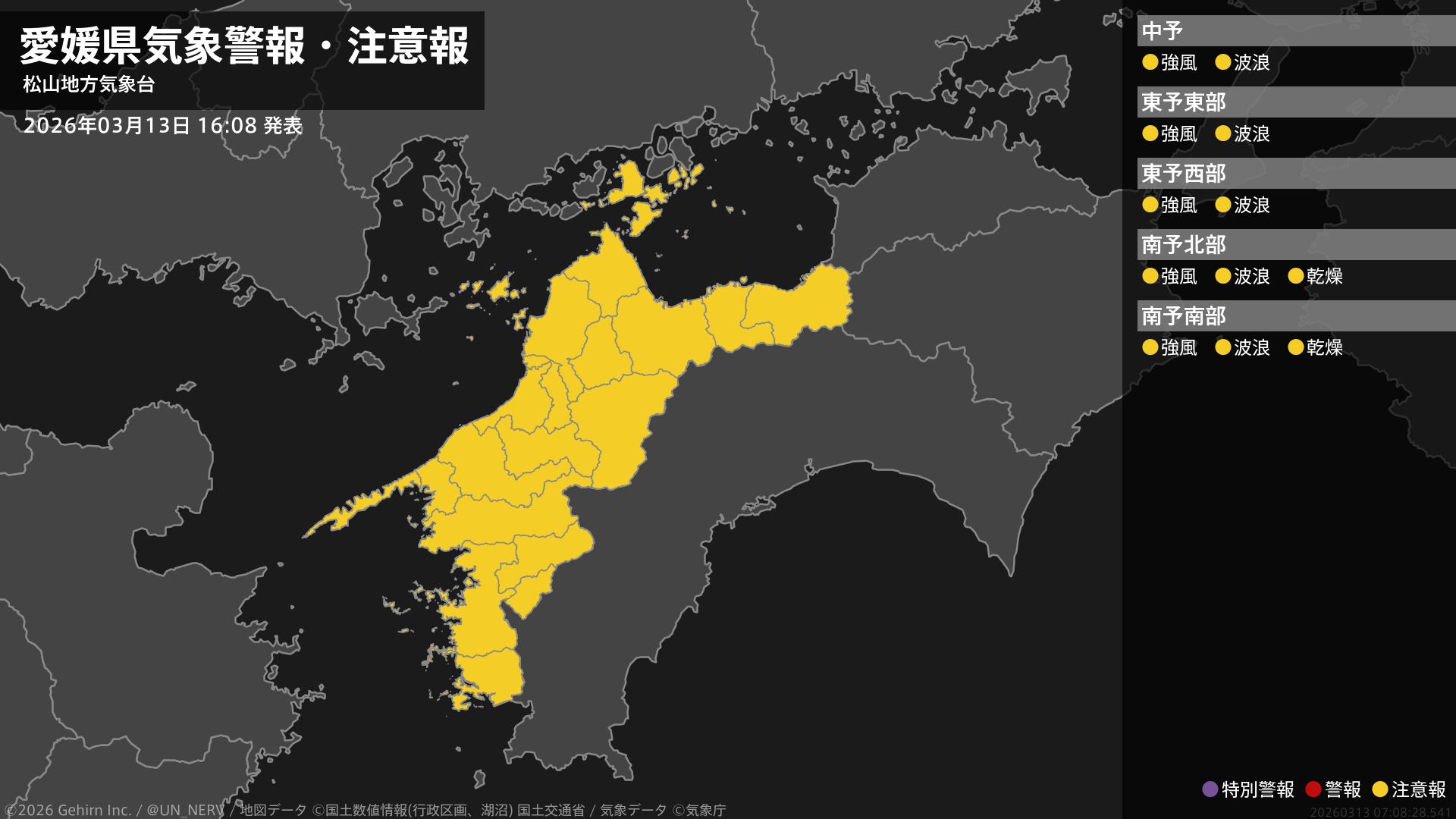 【愛媛県 気象警報・注意報 2026年03月13日 16:08】
